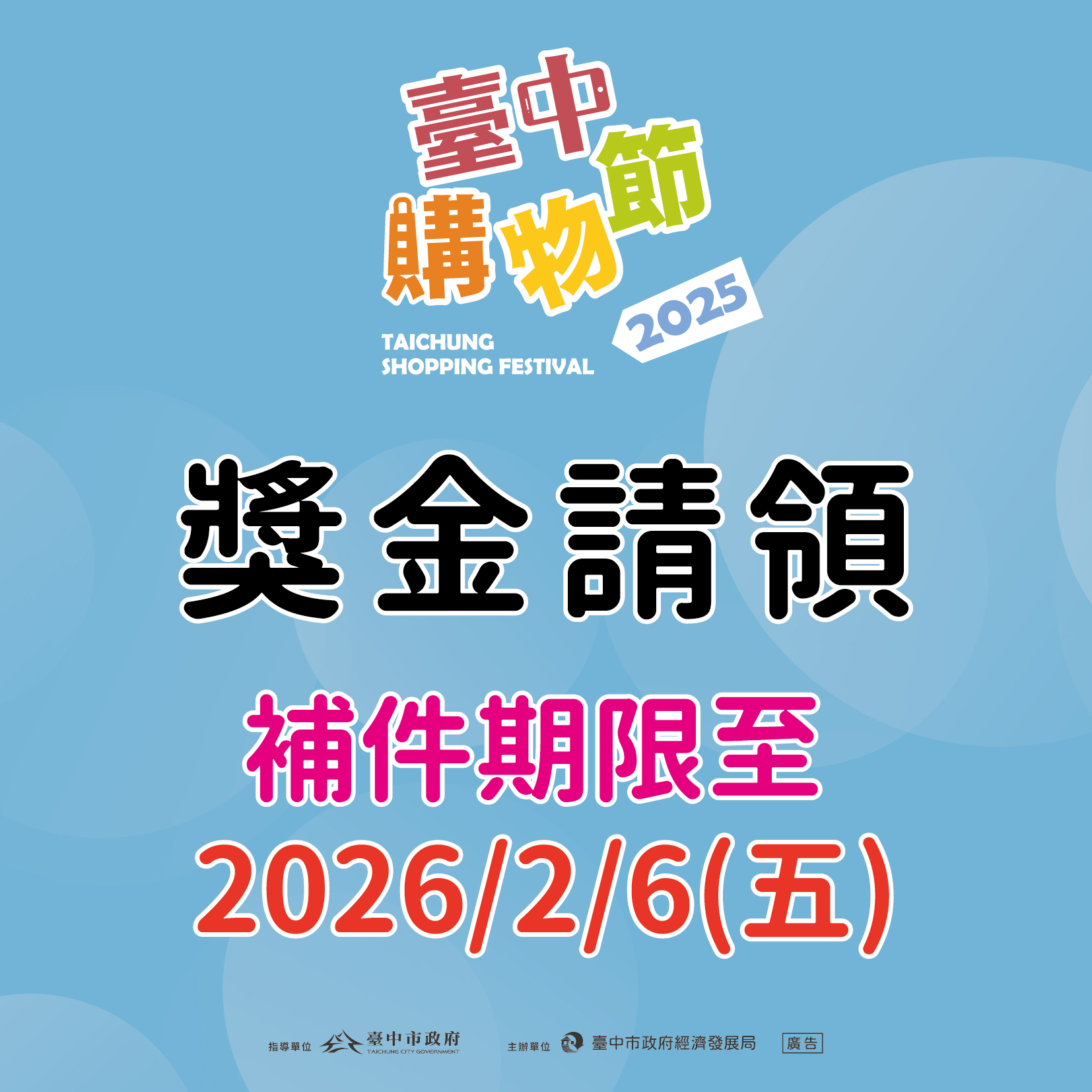 2025台中購物節已於去年12月25日圓滿落幕,活動再創亮眼成績,消費登錄金額突破374億元,平均每日消費登錄金額超過6億元,充分展現台中強勁的消費動能。台中市政府經濟發展局表示,此屆購物節共揭曉逾6萬名中獎民眾,目前整體獎金核撥率已達95%,累積核撥金額約2.2億元;提醒尚未完成請領或仍需補件的中獎民眾,獎金請領及補件期限延長至2月6日,請務必把握最後時間。