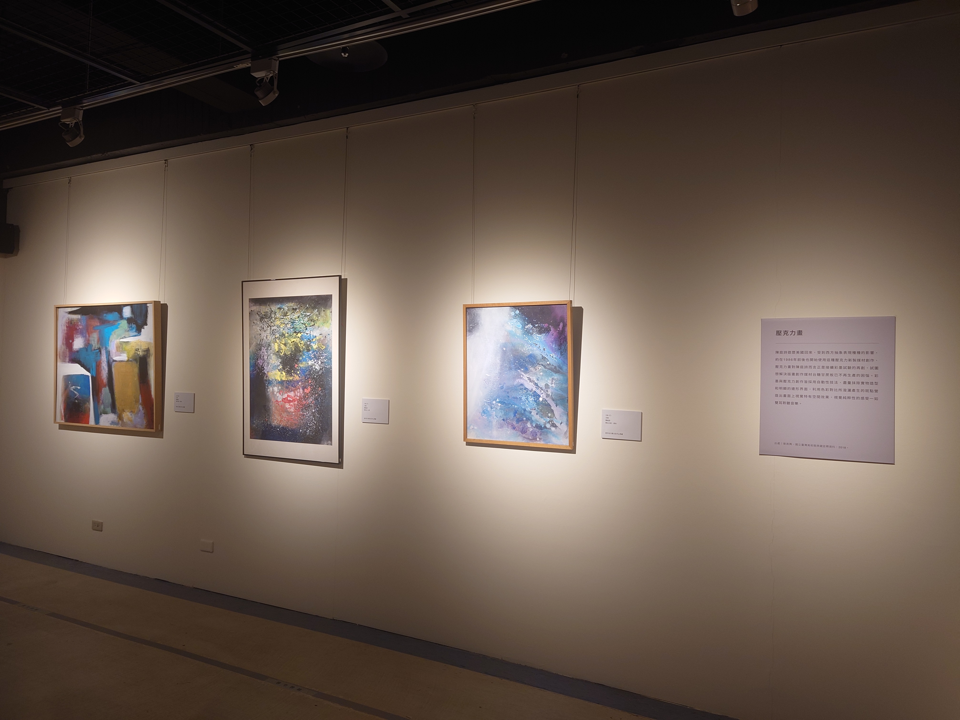 展覽的一大亮點為陳庭詩旅美返台的壓克力畫作,這時期的陳庭詩受到西方抽象表現的影響,約於1986年前後,開始嘗試壓克力的新興媒材,並採用自動性技法創作,刻意抹除實物造型與明顯邉形,利用色彩對比與潑灑斑點,營造出獨特的視覺空間感。其作品多不命名,而以創作年份與件數作為編碼,〈86-17〉,即代表1986年的第17件作品,而這份純粹則留給了觀眾更多自由想像的空間。