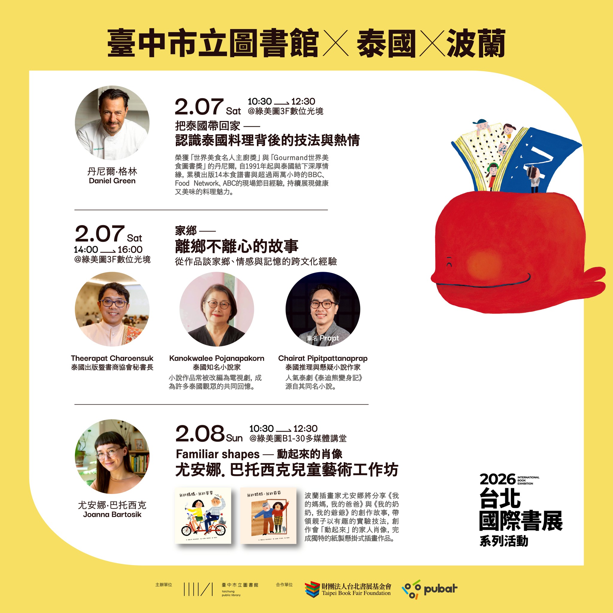 親子族群同樣能在國際交流中找到樂趣。2月8日上午,將由波蘭童書作家暨插畫家尤安娜.巴托西克(Joanna Bartosik)帶來兒童藝術工作坊,分享繪本《我的媽媽,我的爸爸》與《我的奶奶,我的爺爺》的創作故事,並引導親子動手製作「會動起來」的家人肖像,讓孩子在創作中體驗閱讀與藝術的樂趣。