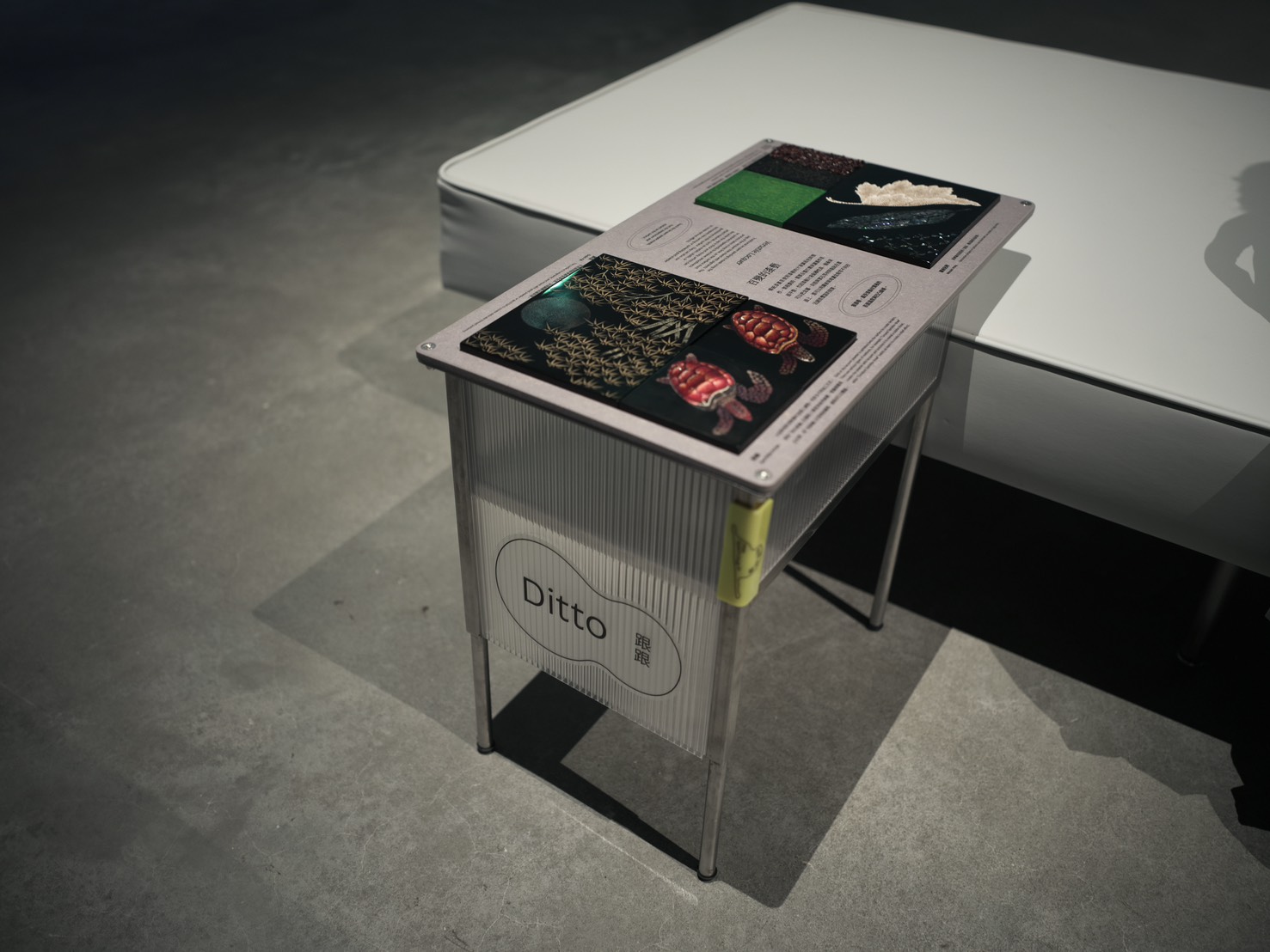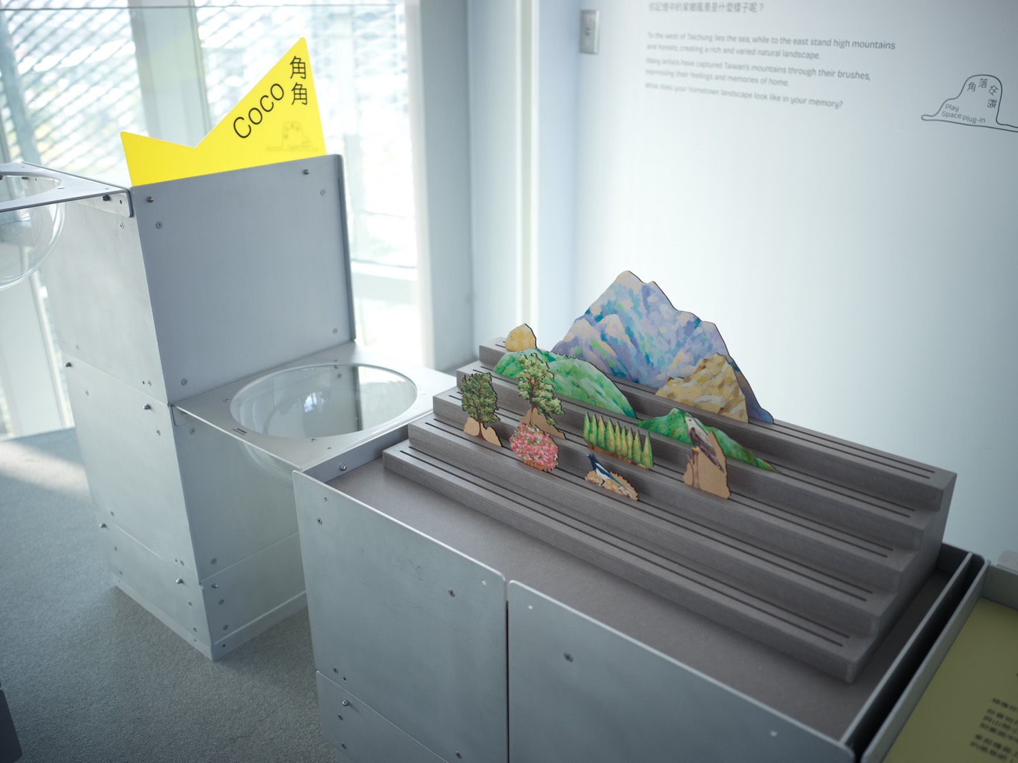 此外,中美館的「角落任務 Play Space Plug-in」教育推廣計畫,將互動體驗融入館內各個角落,邀請觀眾透過小任務親近藝術。每個角落任務都有一個可愛的名稱,「角角」是讓觀眾創造不同風景、「框框」可以用蠟筆感受建築外牆金屬擴張網的紋理、「變變」讓民眾觸摸藝術家陳幸婉〈大地之歌 No.1〉的複合媒材布料、「跟跟」則透過材質板引導觀眾感受人間國寶王清霜〈佇聆孔雀〉中的漆藝技法,以及設置於圖書館兒童閱覽區二樓的「亮亮」,則引導大小朋友在陽光穿越擴張網與大片窗戶灑落的光影中,拼組屬於自己的綠美圖探索故事。