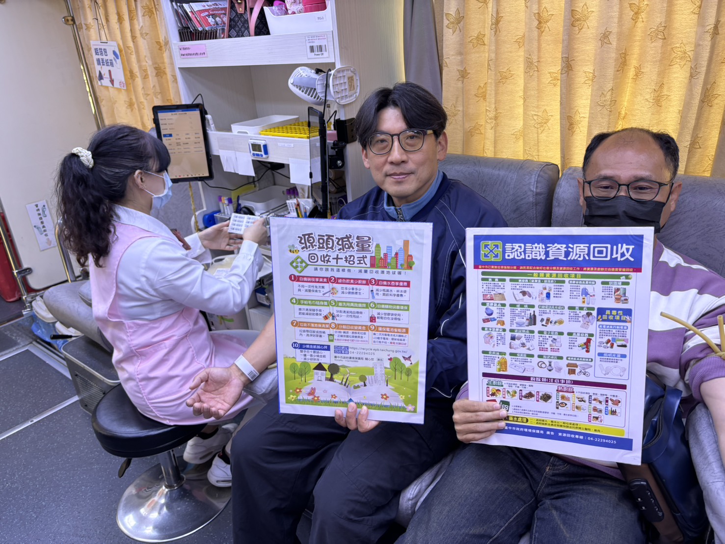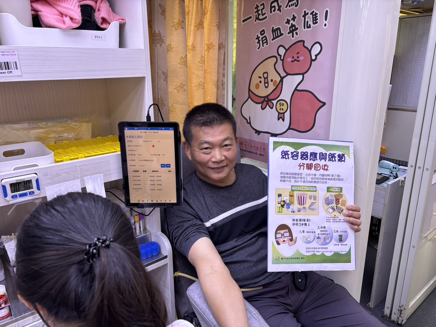 環保局分享,今日有3位亮點隊員,包含豐原區隊熱血滿溢的隊員王玉玲,年資達23年的她做公益不落人後,每年就等待環保局公布捐血時間衝第一個報名,在清潔隊就能就近捐血救人,何樂而不為,希望自己的熱血能幫助需要幫助的人,挨這一針就值得了。另外才剛請調到清水區隊還不滿2個月、89年次的臨時工王柏皓,絕對是區隊超級年輕「新血」,活潑健談的他平時會跑步運動、每年都會固定捐血一兩次,笑著說因為自己太瘦了,血管很好找到,可以說是很適合捐血的天選之人。