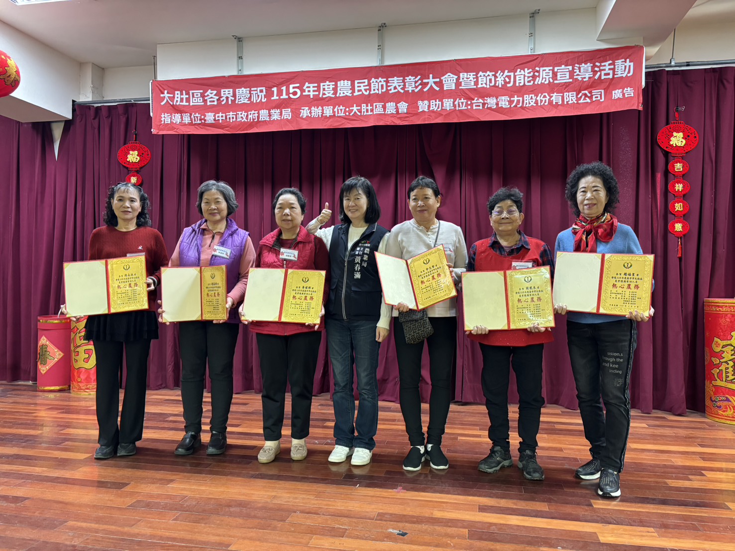 農業局表示,二十四節氣之首「立春」訂為農民節,象徵春回大地、萬物滋長,農民亦隨之展開新一年的春耕準備。為慶祝農民節並表彰傑出農民,台中市各級農會陸續舉辦農民節表揚活動,公開表揚人員,涵蓋優良小組長、資深農民暨示範農家、農事推廣、家政推廣、植物保護、果菜運銷、績優契作農戶、模範果菜農、績優青年農民、水利有功人員、四健推廣及志工服務績優等多項類別,充分展現台中農業多元發展成果與穩固基礎,為台中農業注入更多動能。