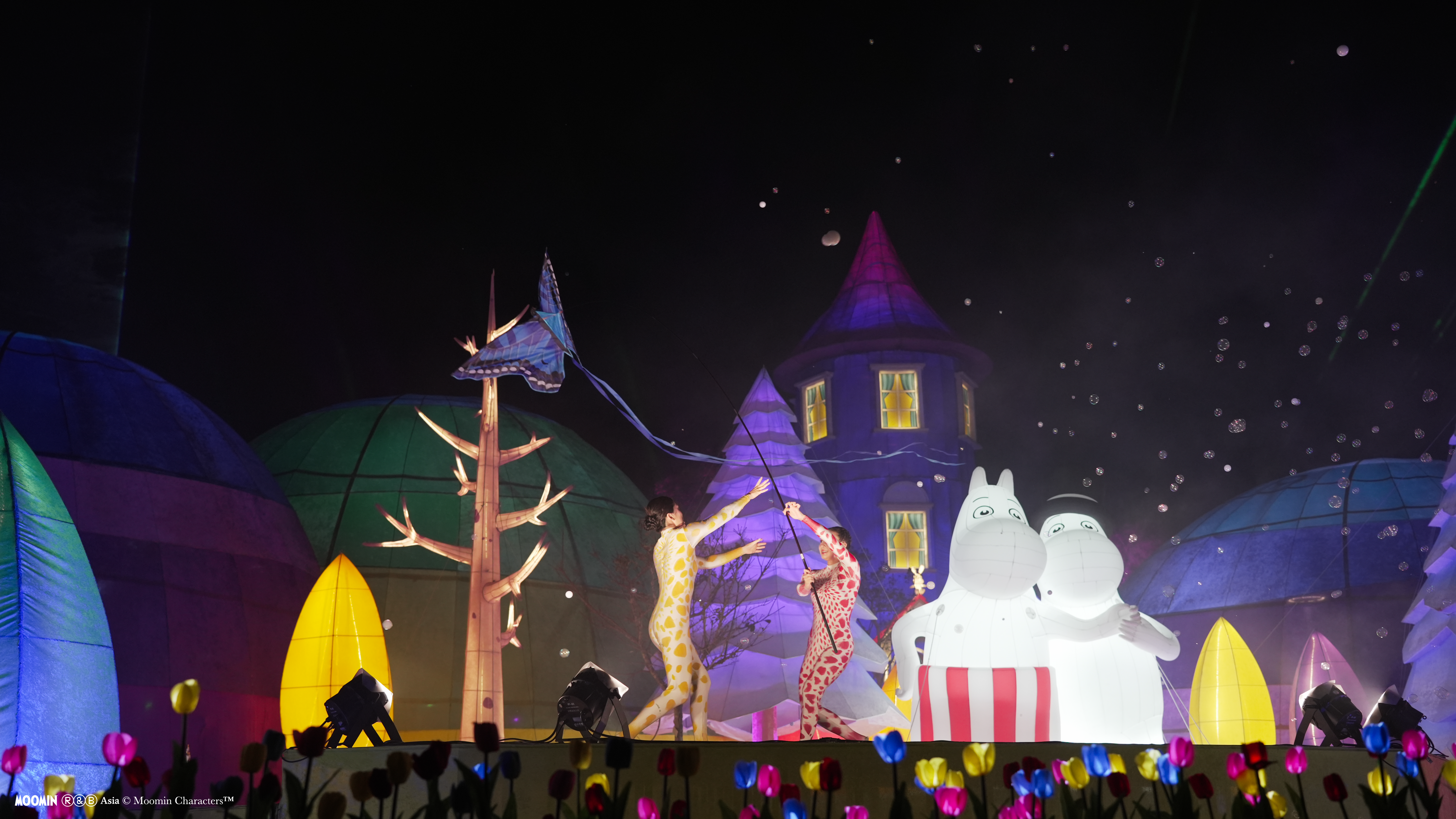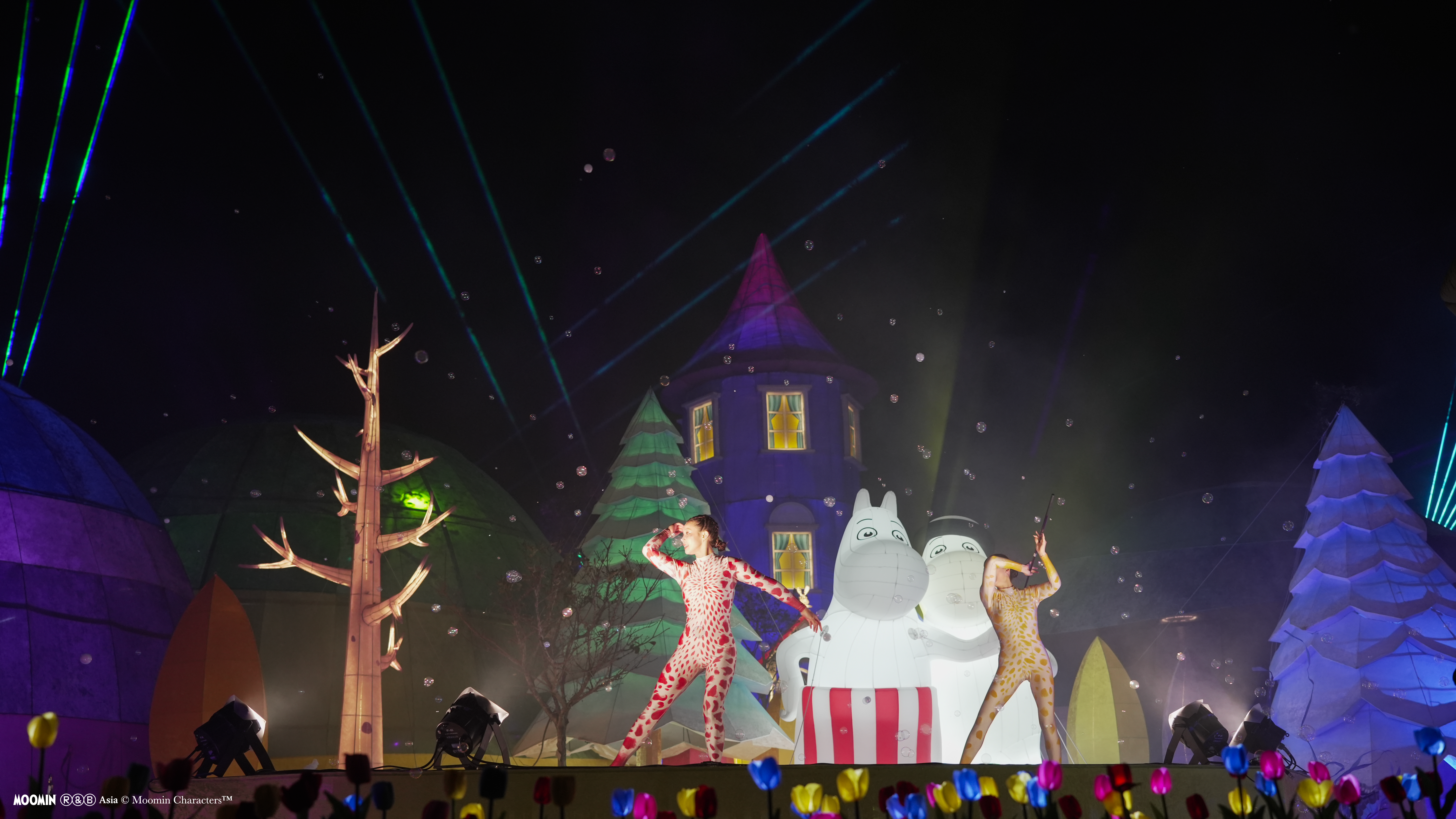 鄭副市長表示,中台灣燈會自2月15日(小年夜)點燈至3月3日(元宵節)閉幕,展期16天期間僅除夕休展。適逢農曆生肖馬年即將到來,為讓傳統藝文節慶邁向國際,中台灣燈會今年特別與Rights and Brands Asia(RBA)旗下80週年的全球人氣IP「姆明一族(The Moomins)」跨界合作,巧妙取用”Moving on”的諧音與姆明(Moomin)的角色形象,以「幸福蜜馬 台中MOOMIN ON!」為主題,打照以姆明一族為主角的展區。主燈區「極光下的姆明谷」以有著紅瓦屋頂、藍莓色外牆的15公尺高「姆明家」為視覺焦點,述說親友間彼此相愛、互相接納的暖心敘事,技術上更突破以往IP氣偶只能靜態觀賞的框架,結合動態機械科技,讓氣偶搭乘環形軌道列車穿梭於樹林山谷間,搭配如蝴蝶飛舞的高空綢吊專業舞者,輔以彩雷、煙霧呈現漫天極光的效果,加上特效泡泡帶來的驚喜,全方位營造出這場洋溢著希望與幸福的夢幻極光秀。