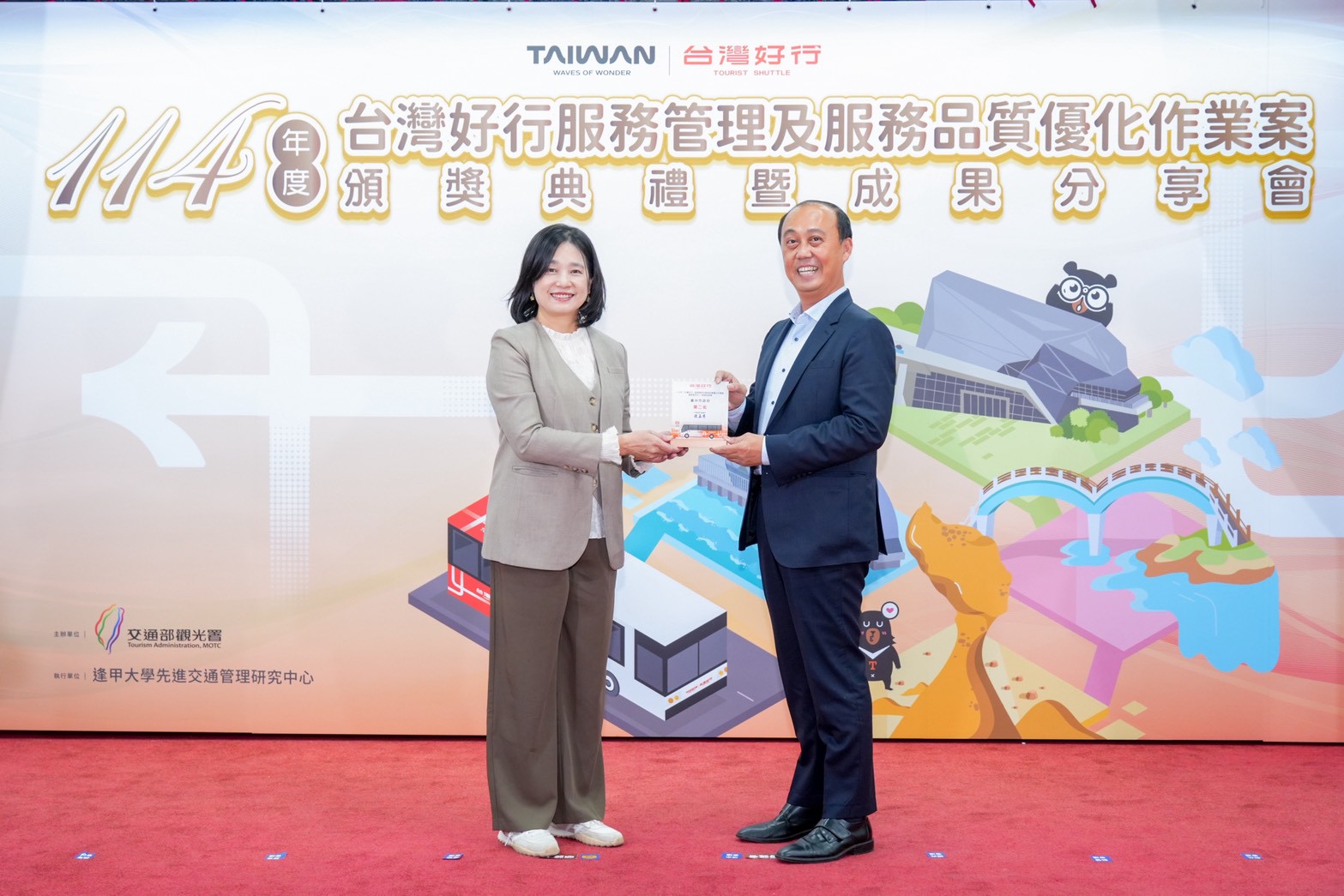 市府觀旅局長陳美秀表示,新的一年剛開始,台中國際機場航線已拓展至26條,台灣好行及觀光公車路線串連台中市重要景點,輕鬆遨遊台中山城、海線、屯區及都心熱門旅遊景點,提供自由行旅人探索台中絕佳方式,台中推動台灣好行成效顯著,觀旅局除連續兩年獲評交通部觀光署台灣好行評鑑績優單位,今年更獲得「台灣好行服務管理及服務品質優化評比」全國第2名殊榮,一馬當先成為推動單位中唯一榮獲名次的地方政府,台中將持續投入並優化觀光旅遊服務,提供旅客友善的旅遊體驗,為自由行旅客加足馬力。