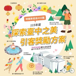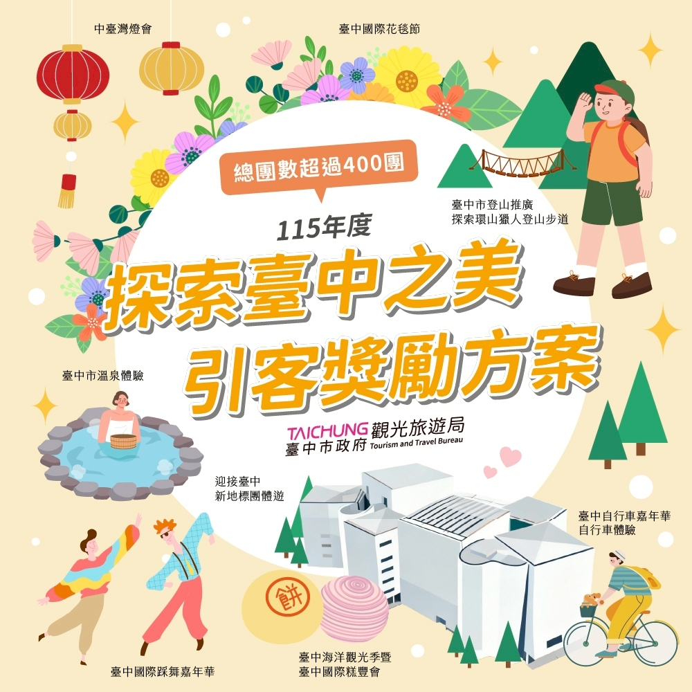 陳局長指出,「探索台中之美 引客獎勵方案」推動邁入第3年,每年都吸引許多國內外的旅客參與,為推動深度遊程及台中品牌亮點活動,115年度更搭配9大主題推出全新的獎勵方案,涵蓋節日慶典、特色體驗、戶外運動與文化盛宴等多元面向,更融入新興會展觀光活動主題,拓展更多不同客群參與,全年度不同主題提供旅客多元體驗,預定獎勵總團數將超過400團,只要在活動期間透過旅行社組團安排入住台中合法旅宿,達成指定條件即可申請獎勵優惠,額滿為止,可望帶動新一年度更多觀光人潮。