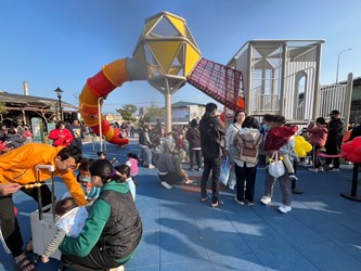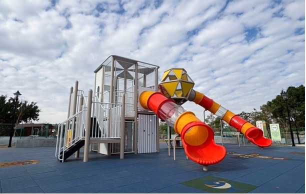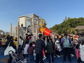 陳局長指出,此案總經費約625萬元,改善範圍約280平方公尺,遊戲場以「探索城堡」為設計主軸,設置立體複合式遊具作為視覺與活動核心,結合多層平台、攀爬設施與封閉式管狀滑梯,串聯形成連續且富探索感的遊戲動線,讓孩童如同在樹屋間穿梭冒險,提升遊戲的趣味性與挑戰性,鼓勵孩子在遊戲中培養勇氣與探索精神。