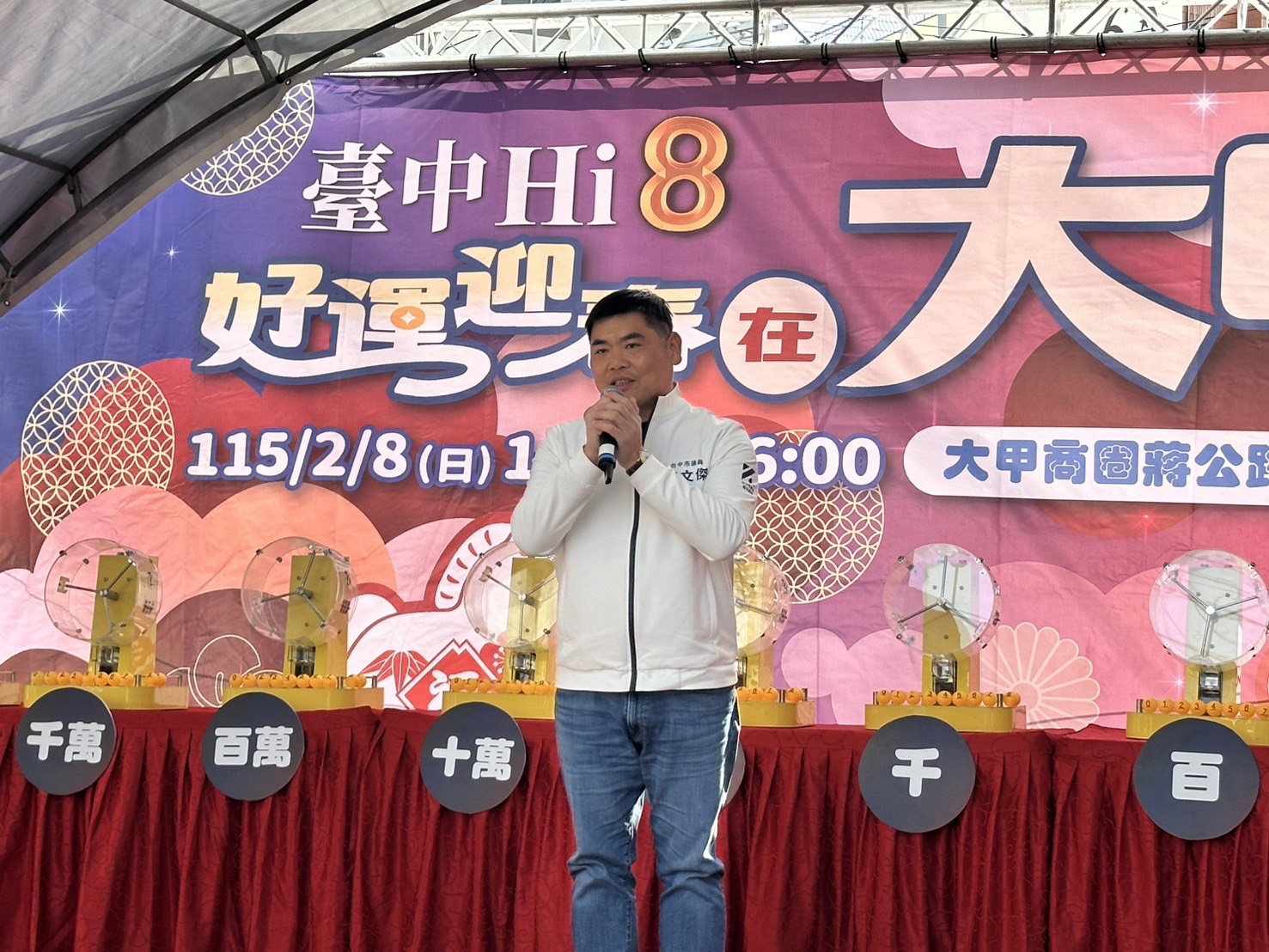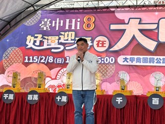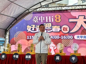 「台中Hi8 全城開趴」活動熱度持續攀升!自去年12月26日開跑,截至今年2月6日止,累積消費登錄金額已突破新台幣129億元。迎接農曆春節,台中市政府經濟發展局今(8)日在大甲商圈舉辦「台中Hi8 好運迎春在大甲」抽獎活動,由副市長鄭照新與現場貴賓共同抽出108萬元現金壓軸大獎,幸運得主為來自大雅區的陳先生。陳先生接獲中獎通知時特地停靠路邊接聽電話,開心表示將把獎金用來購買新車,為新年添喜氣。活動現場亦同步加碼線上抽出5名70吋電視得主,以及「台中通APP下載突破310萬」的機票獎項,掀起一波又一波歡呼聲。