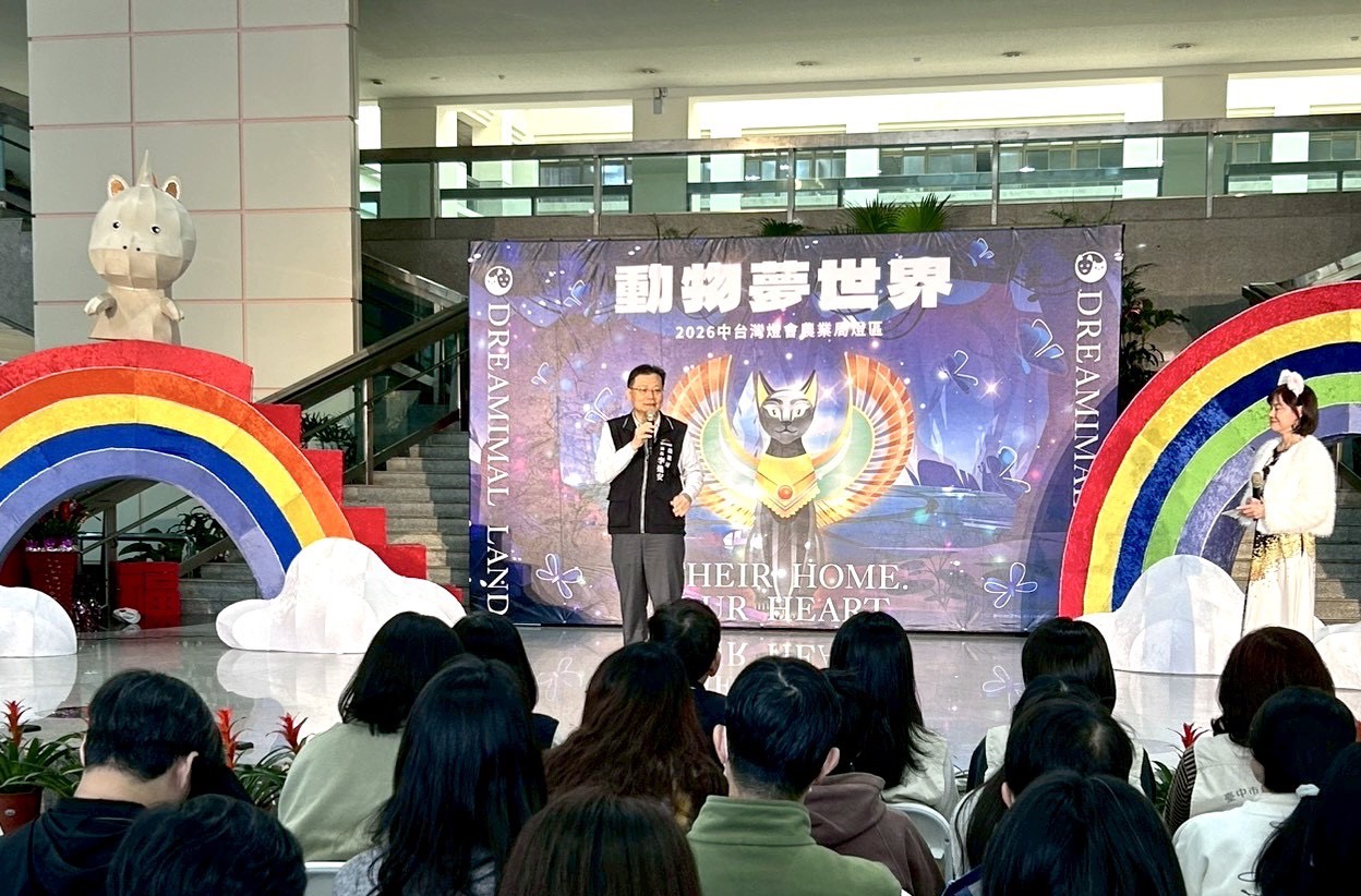 2026中臺灣燈會即將於2月15日盛大登場,動物保護防疫處今(9)日於市府陽明大樓舉辦農業局燈區宣傳記者會,正式介紹「動物夢世界」燈區裡的各燈組設計及布置巧思,以「動物有家 城市有愛」為核心精神,透過燈光藝術與故事場景,打造沉浸式觀展體驗,讓民眾在賞燈之餘,也能感受動物與人相互陪伴的溫暖連結。
