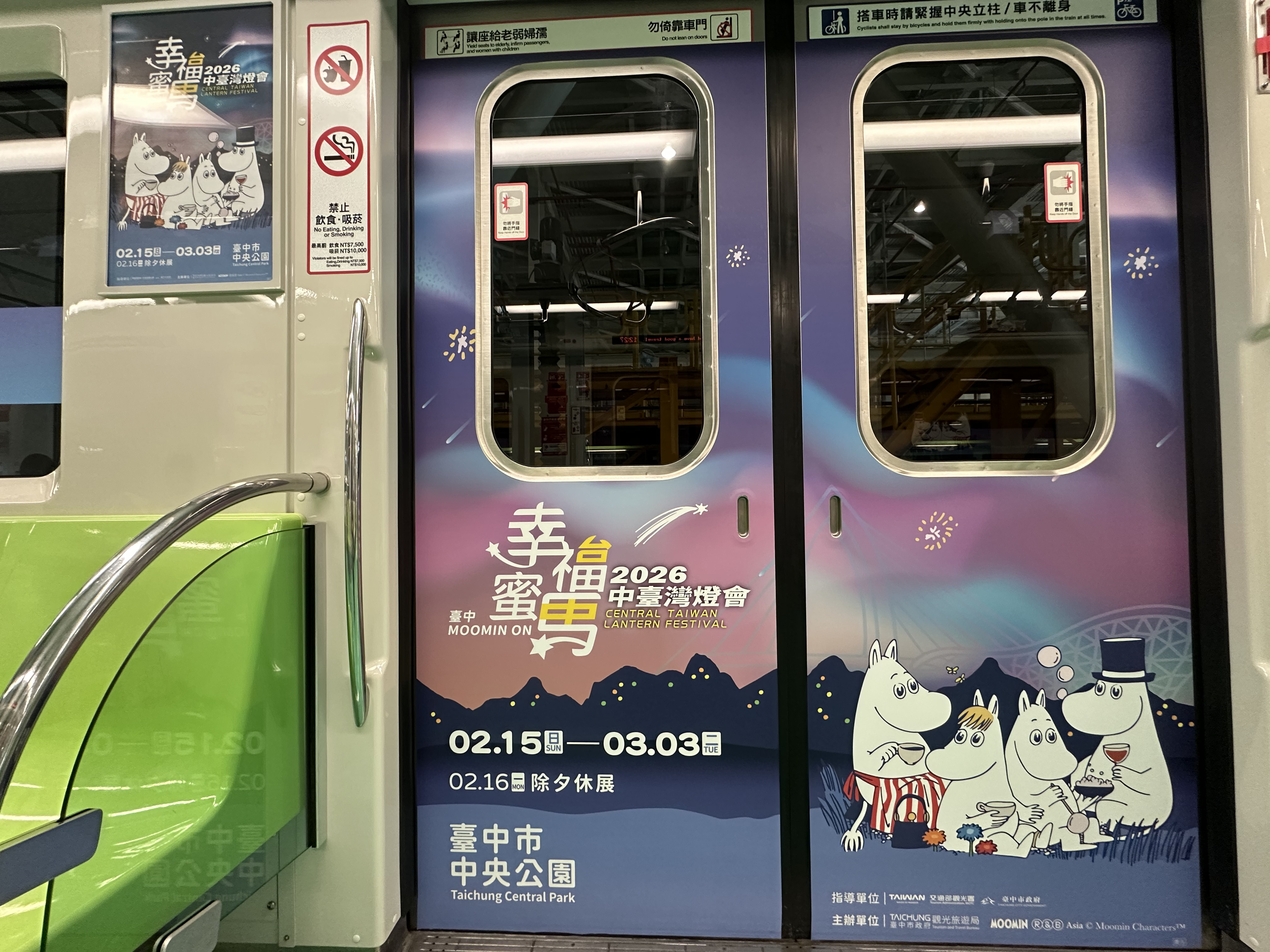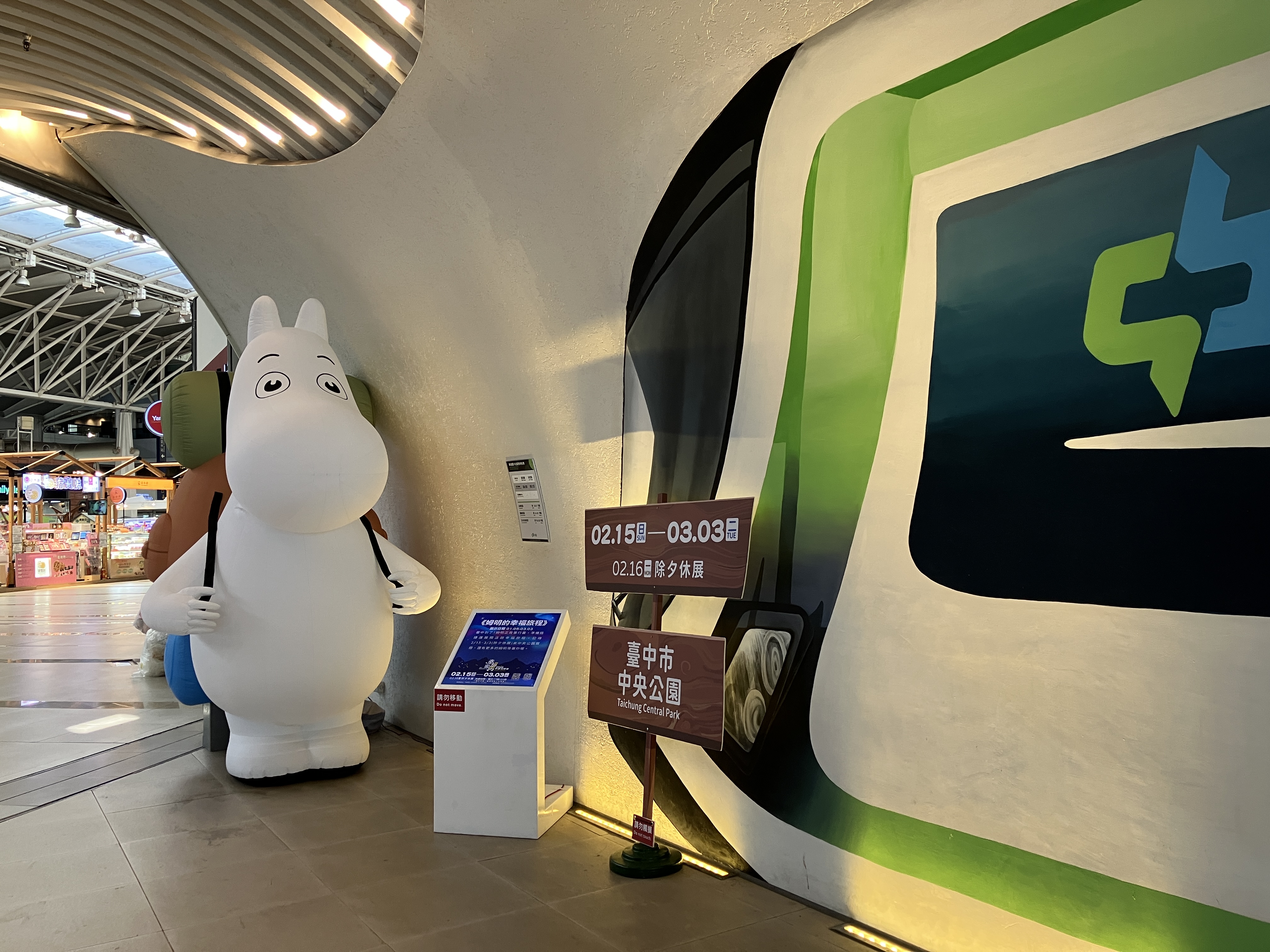 中台灣燈會今年以「幸福蜜馬」為主題,首度攜手國際知名IP「姆明一族(The Moomins)」跨界合作,超萌角色陪伴民眾一起幸福「Moving on」。中捷公司響應燈會主題,特別將姆明一族的可愛身影融入捷運系統,不僅推出吸睛的「姆明一族彩繪列車」,在捷運高鐵臺中站出口處也設置「姆明氣球模型」,成為熱門拍照打卡點,讓旅客一出站就能感受滿滿童話氛圍。