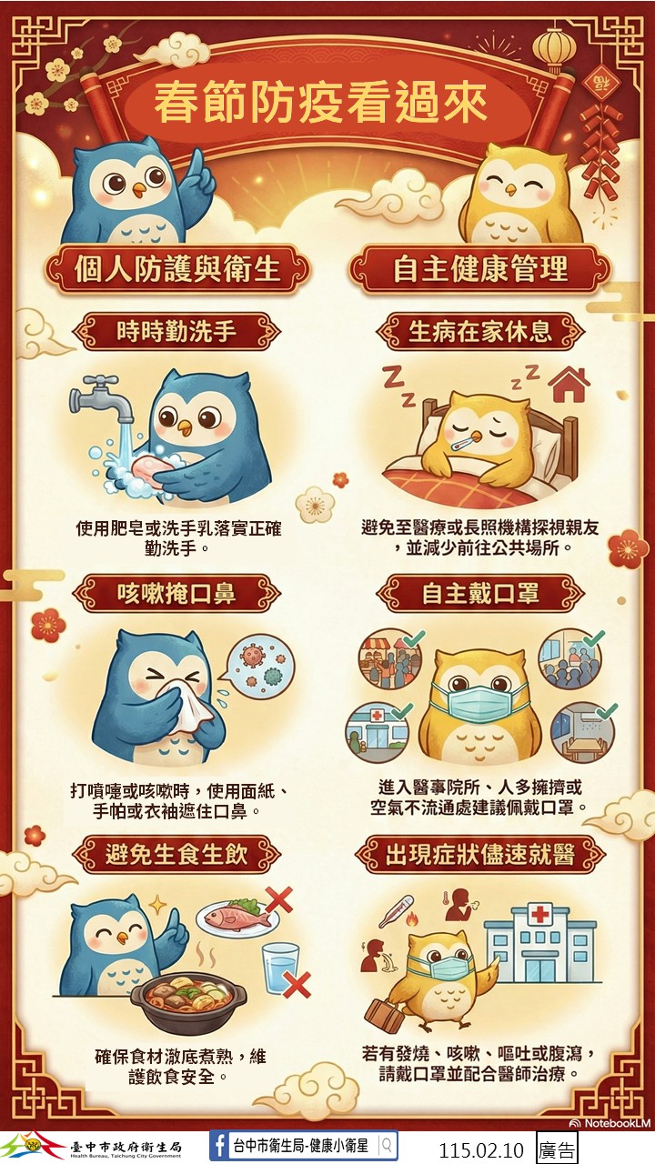 衛生局也呼籲,春節期間應持續落實健康防疫習慣,外出或前往人潮密集場所時請自主配戴口罩,勤洗手並遵守呼吸道咳嗽禮節;飲食方面避免生食、生飲,食物應澈底煮熟後再食用。如有症狀應儘速就醫並在家休息,以降低疾病傳播風險。