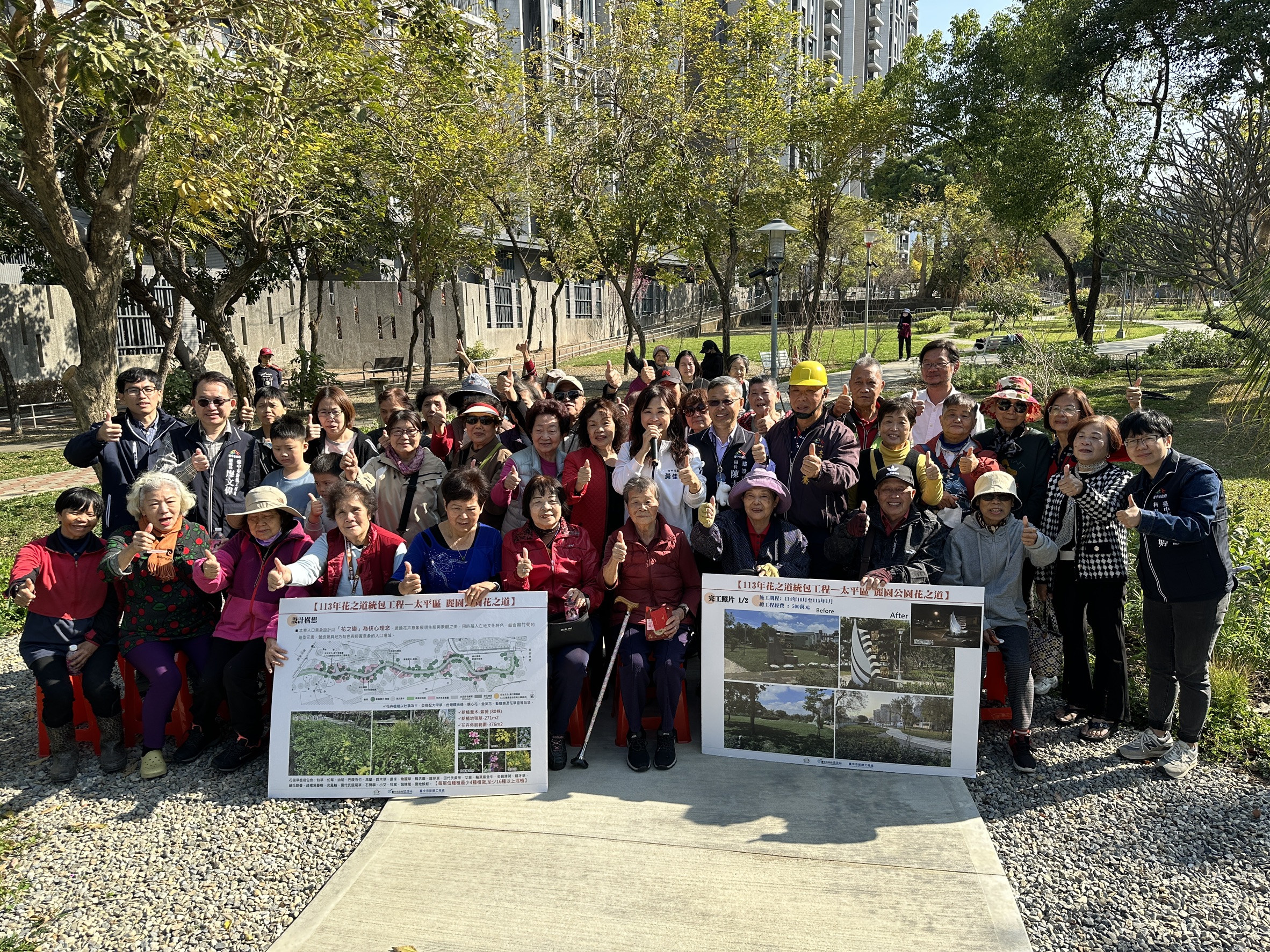 陳局長說明,花之道計畫以「自然花園」為設計主軸,致力將城市美學融入日常生活。繼北區興進園道延伸段(進化路至育興街)、育德園道(尚德街至五常街)、大里區長榮園道及南區忠明園道(南和路至美村南路段)陸續完工後,此次花之道選址於太平區麗園公園(鄰環太東路側),總面積2,240平方公尺,位處社區核心,是市民運動休閒的重要空間。