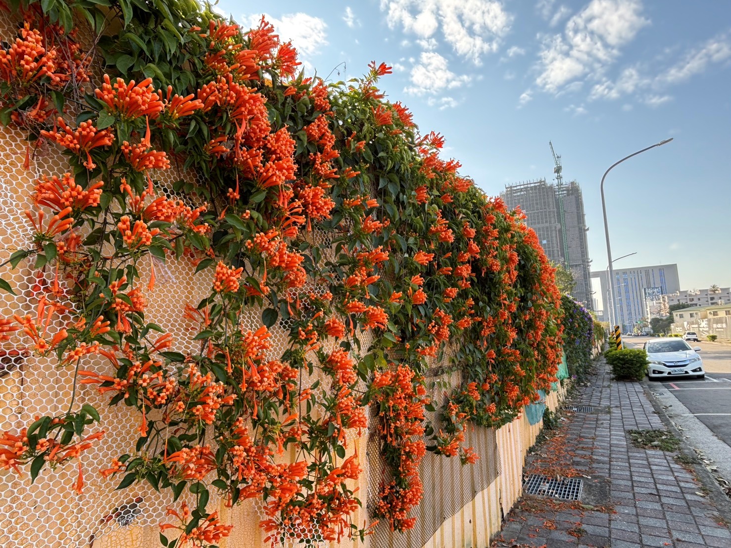 為迎接馬年新春,台中市政府環境保護局推動清潔隊部綠美化工程成果亮眼!位於中西區的清潔隊環保友善停車場及清淨園區外牆,近期炮仗花盛開,火紅花瀑沿牆垂落、隨風搖曳,為街道妝點濃厚年節氛圍,也吸引不少民眾駐足拍照,成為社區賞花新亮點。