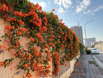 清淨園區炮仗花如瀑布般垂掛牆面,形成壯觀火紅花牆