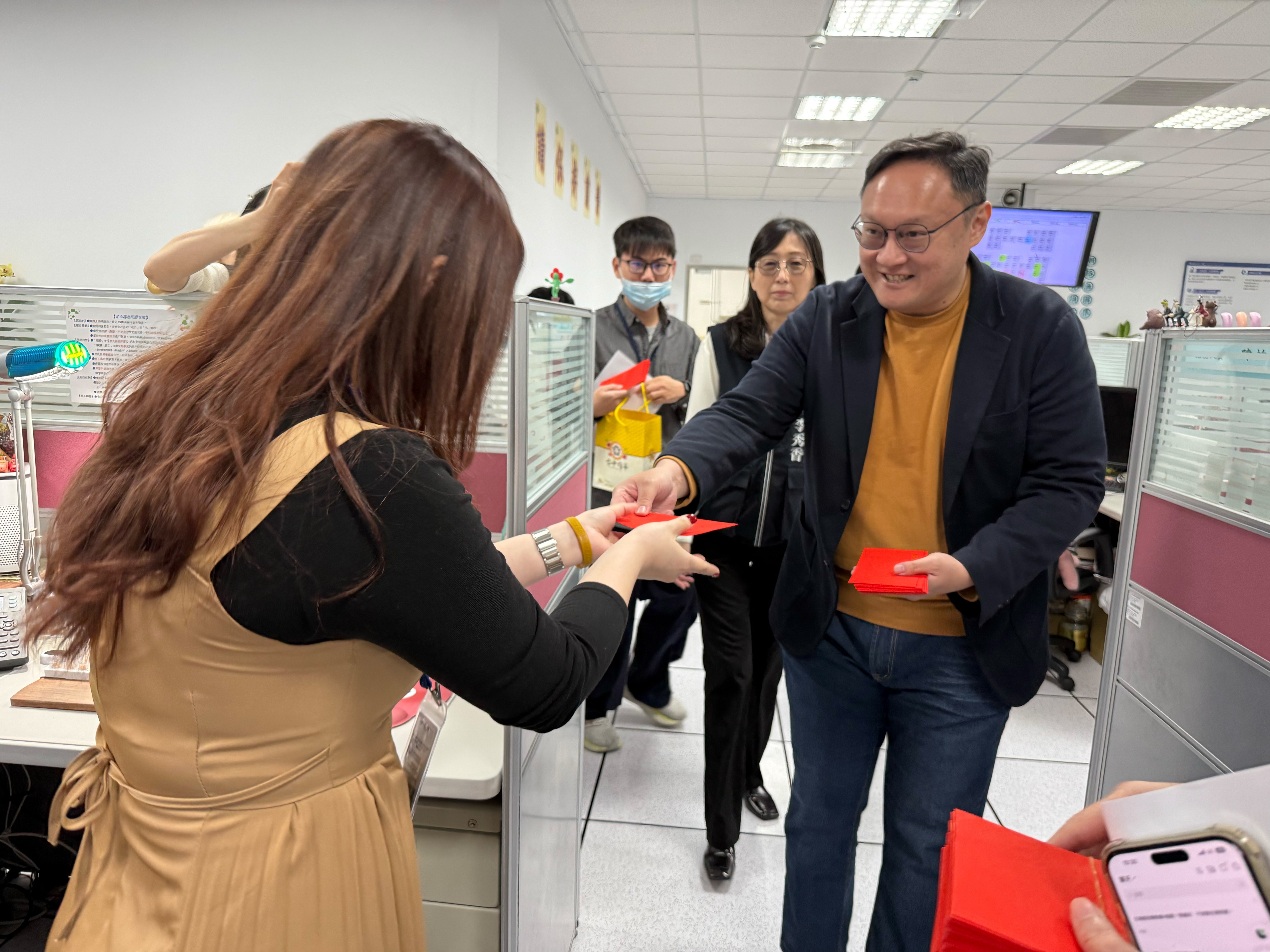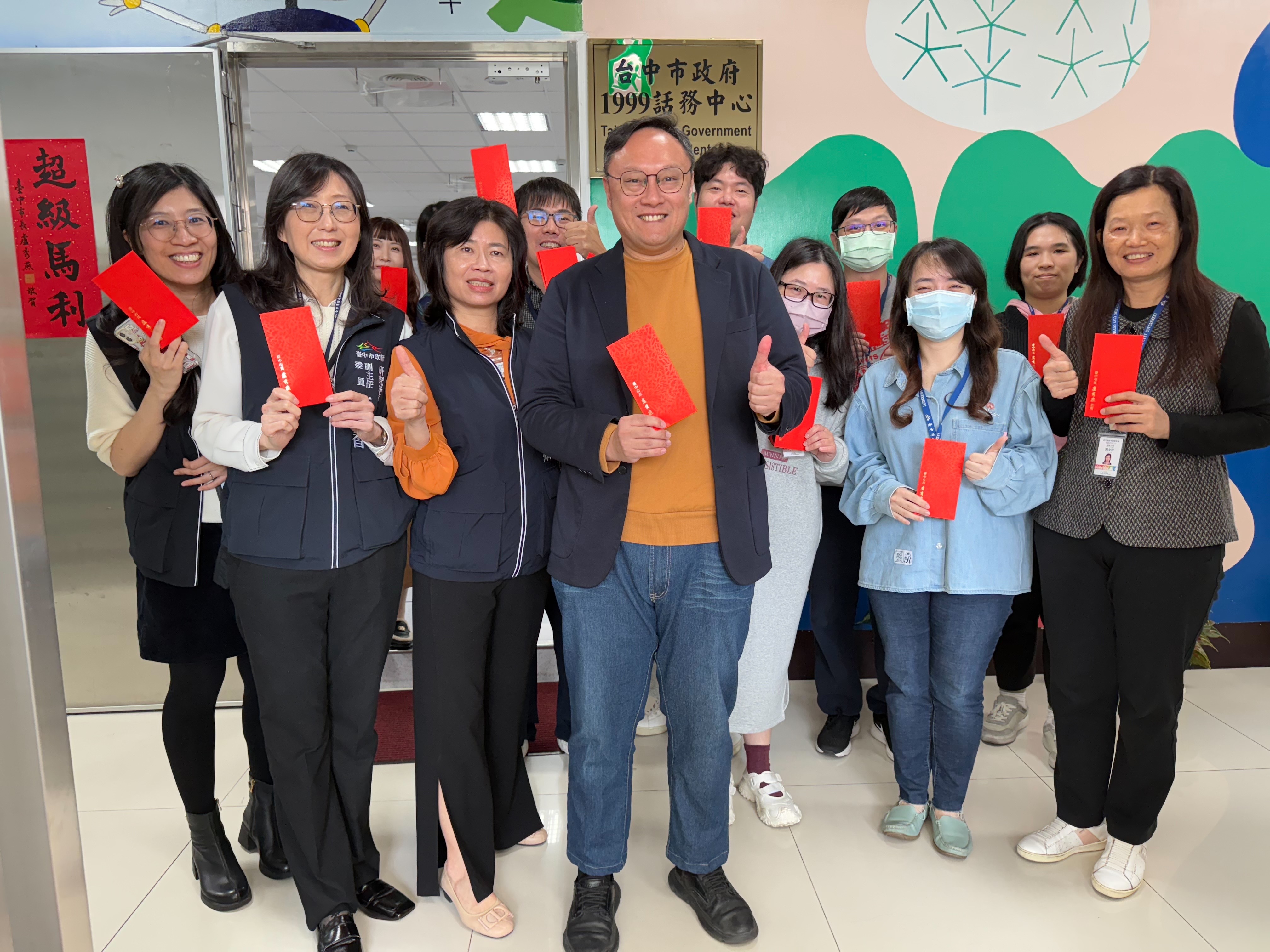春節將至,台中市政府1999市民專線24小時服務不打烊。副市長鄭照新今(12)日代表市長盧秀燕前往1999話務中心慰勉同仁,致贈春節紅包並表達感謝,肯定話務團隊全年無休守護市民需求,期勉持續將溫暖與效率傳遞到市民手中,陪伴市民家人「龍馬有春」迎新年。