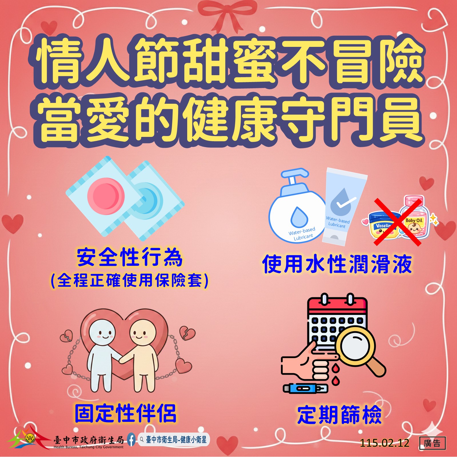西洋情人節適逢春節連假,伴侶間約會與親密互動增加。台中市政府衛生局提醒,愛滋病毒(HIV)、梅毒及淋病等性傳染病感染不限特定性別或性傾向,只要未落實安全性行為,皆有感染風險。為守護自己與伴侶健康,應正確使用保險套並定期篩檢,讓愛更安心、更長久。
