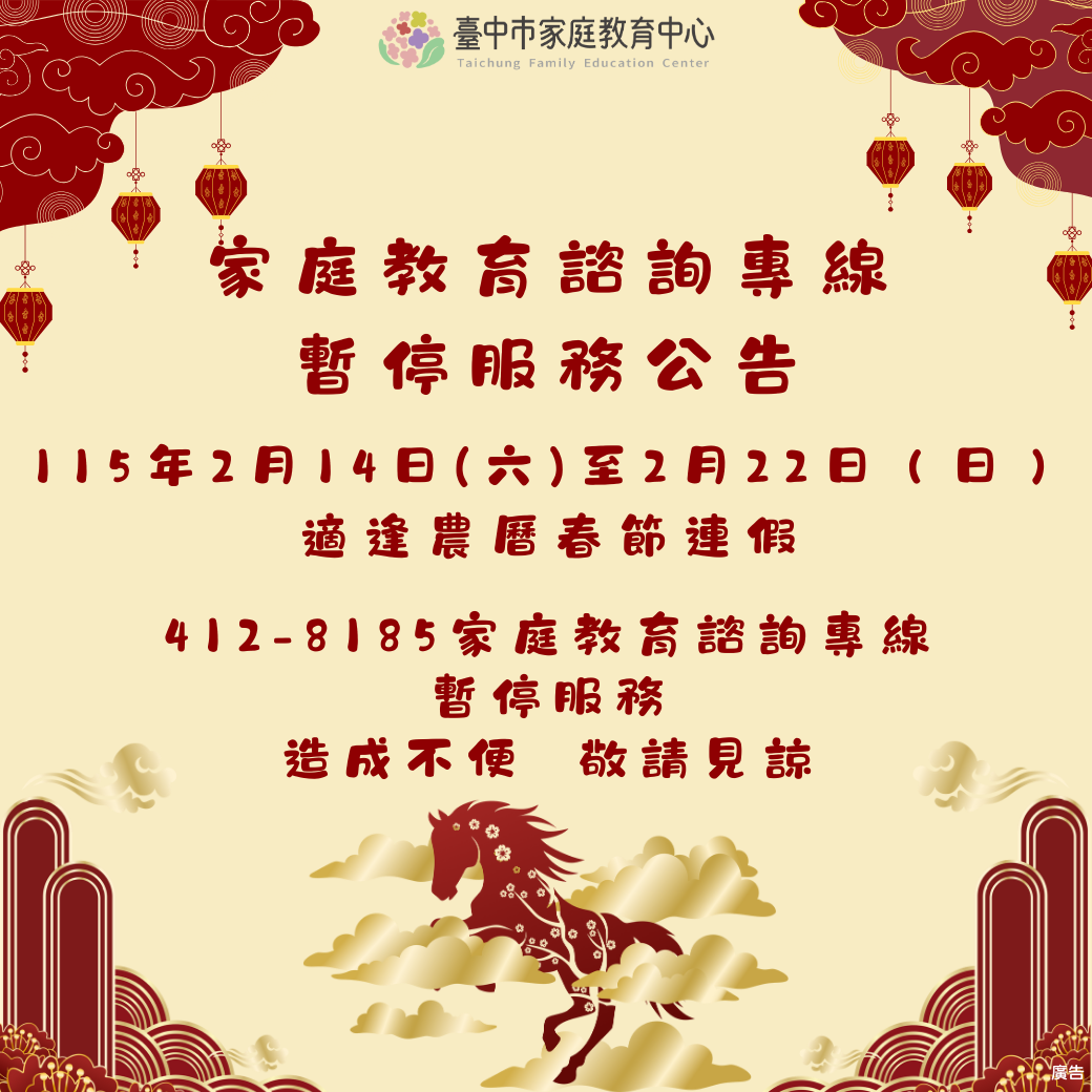 115年2月14日(六)至2月22日(日),適逢農曆春節連假,412-8185家庭教育諮詢專線暫停服務。