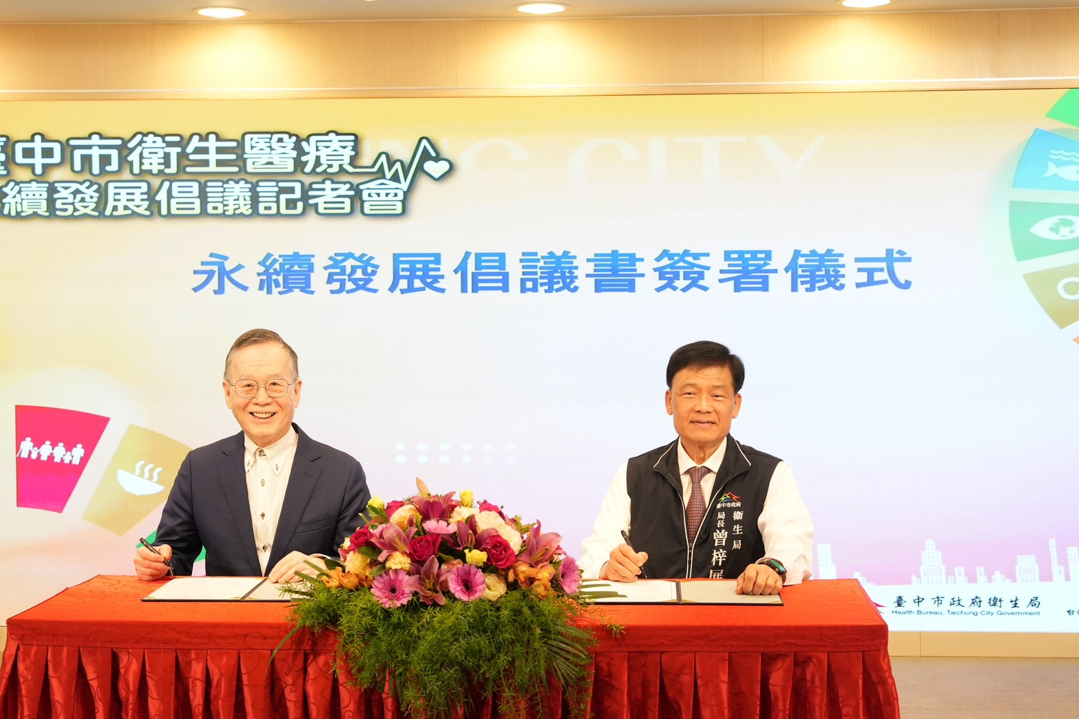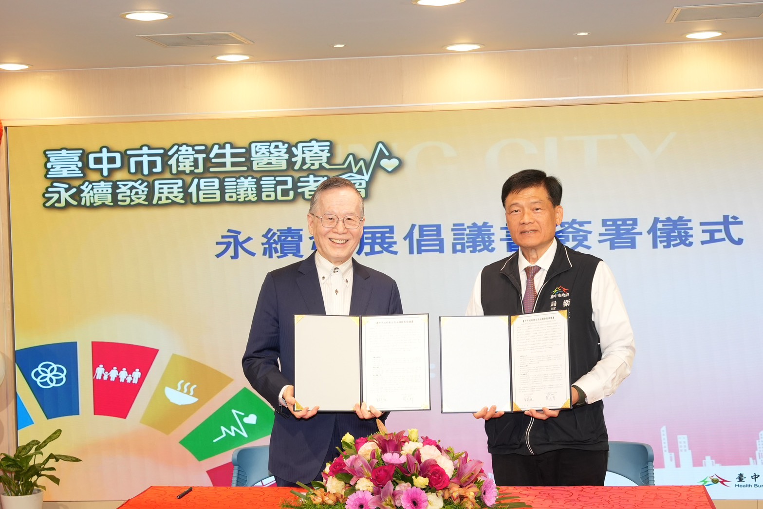 台中市政府衛生局今(13)日舉行「台中市衛生醫療永續發展倡議記者會」,由市府秘書長黃崇典擔任見證人,並由衛生局長曾梓展與台灣永續能源研究基金會董事長簡又新共同簽署永續發展倡議書。衛生局同時發表推動「公衛體系淨零策略」成果,不僅率全國衛生機關之先完成2023年溫室氣體盤查報告書、發布全國地方衛生機關首本「自願檢視報告(VDR)」,並積極推動醫療機構低碳認證計畫,獲簡董事長親頒「綠級淨零標章」,展現台中在衛生醫療永續發展上的領航地位。