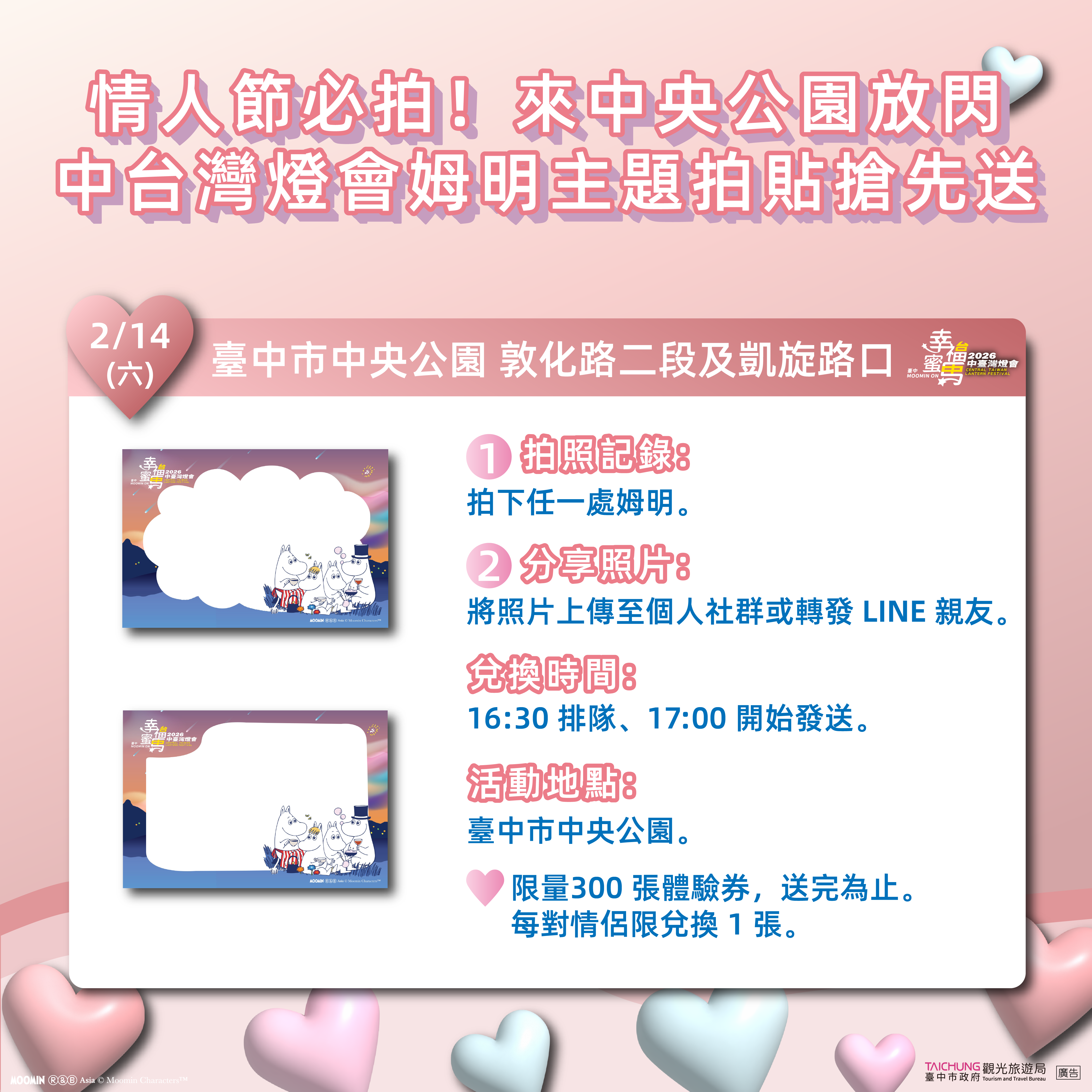 今(14)日就是情人節,最浪漫的約會,是與心愛的人同遊中台灣燈會!第3波「拍姆明、送姆明!」活動,今日午後將在台中市中央公園登場,中市府觀旅局將再送出1,000盞姆明小提燈(14:30排隊、15:00發送)與300份姆明拍貼體驗券(16:30排隊、17:00發送),營造與姆明一族(The Moomins)的溫馨氛圍,歡迎所有情侶不論是男女朋友、夫妻、閨蜜、好友,甚至是「前世情人」帶著寶貝小孩,一起到中央公園留下幸福MOOMIN ON的甜蜜紀念!