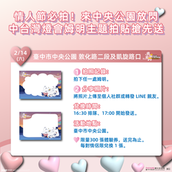 陳局長指出,中台灣燈會未演先轟動,延伸設計的姆明(Moomin)周邊小物,包括融入鐵馬元素的「姆明小提燈」及結合燈會視覺設計的「姆明主題拍貼」,都是今年燈會希望分享給大家的新春祝福。今日「拍姆明、送姆明」活動將於燈會主場地「台中市中央公園」敦化路二段及凱旋路口,再送出1,000盞姆明小提燈(14:30排隊、15:00發送)與300份姆明拍貼體驗券(16:30排隊、17:00發送),只要拍下台中任一處的姆明,分享於自身社群(如FB、IG、Threads),或 LINE 轉傳給親朋好友,今日情人節來到活動現場即可兌換,一起沉浸在「幸福蜜馬 台中MOOMIN ON!」的浪漫氛圍!