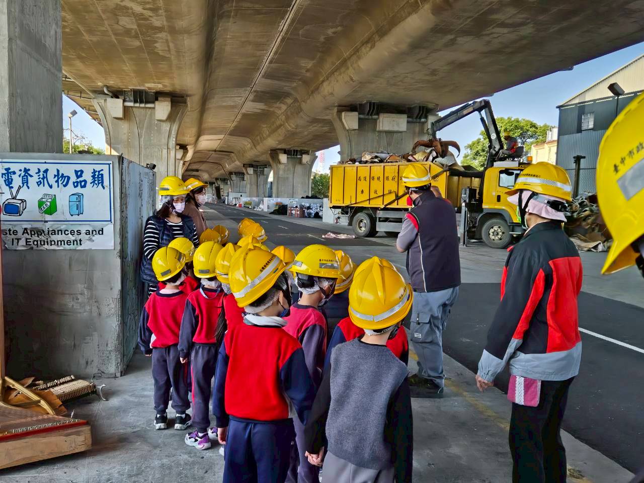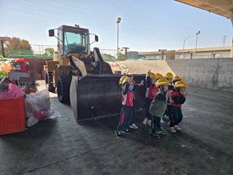 環保局分享,活動中孩子們穿戴整齊、戴上安全帽,在老師、環保志工、現場工作人員的帶領下,有秩序地走進回收場參觀。孩子們親眼看到垃圾車、資源回收車、抓斗車等大型設備如何協助分類與處理廢棄物,個個睜大眼睛、充滿好奇,紛紛發問:「這些瓶瓶罐罐真的可以變成新東西嗎?」除參觀實地設施,孩子們也參加由回收場環境教育人員帶領的環境教育課程,透過互動遊戲、角色扮演與資源分類挑戰,認識「可回收、不可回收」的不同,並了解「減量、重複使用、回收再利用」的重要性。