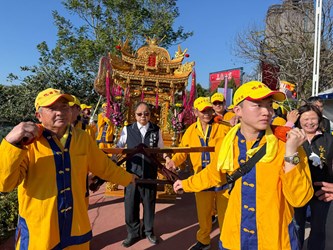 民政局說明,「鴨母寮媽」遶境隊伍於下午3時30分抵達啟航路與經貿三路二段路口,由吳局長親自接駕,在鴨咪仔鼓、永天小鴨義工班、哨角班、將軍班、仙女班及大轎班引領下,媽祖神轎緩步前行,200名信眾虔誠隨行,隊伍依序遶行主燈區,跨橋進入「幸福祈願村」燈區,最終駐駕於海線祈福燈組「永天光耀」前,沿途鑼鼓齊鳴、秩序井然,不少民眾駐足觀禮並以手機記錄盛況,展現宗教文化與燈會活動相互融合的祈福意象。