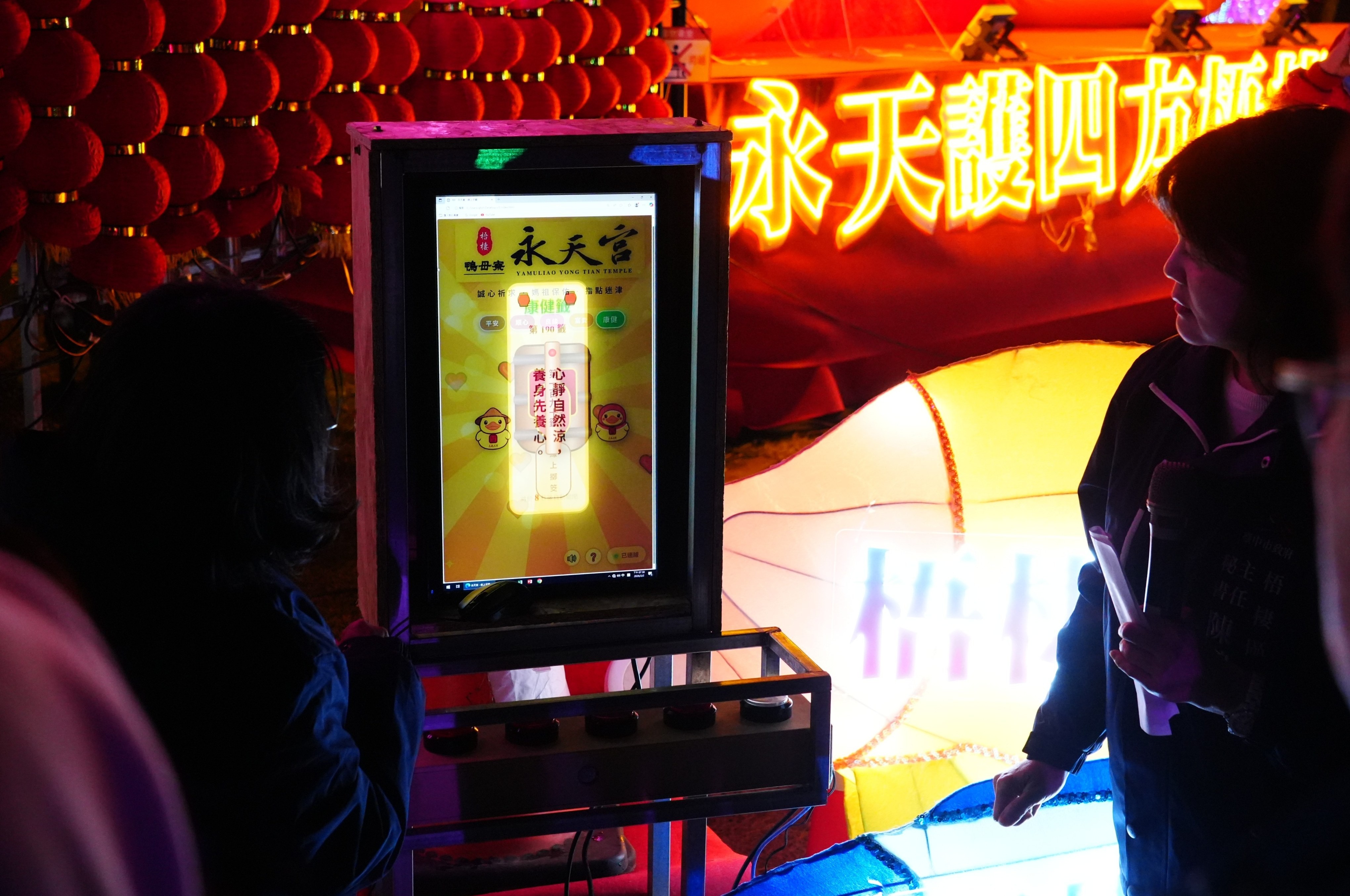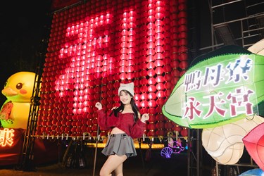 吳局長指出,梧棲鴨母寮永天宮主祀天上聖母,創建於日治時期,1934年由地方耆老發起建廟,長年為地方信仰中心,亦承載聚落公共活動與文化交流功能。此次海線代表燈組「永天光耀」設計融合媽祖信仰與現代燈藝科技,主視覺以永天宮「鴨母寮媽」為核心,結合「永天小鴨」護駕意象、浪花律動與在地地標元素,呈現海洋文化的節奏與祥和能量,燈組後方更以滿滿紅色燈籠拼組祝福語,並結合求籤互動體驗,讓民眾賞燈拍照之餘,也能祈福求好運,感受科技結合信仰的創新魅力。