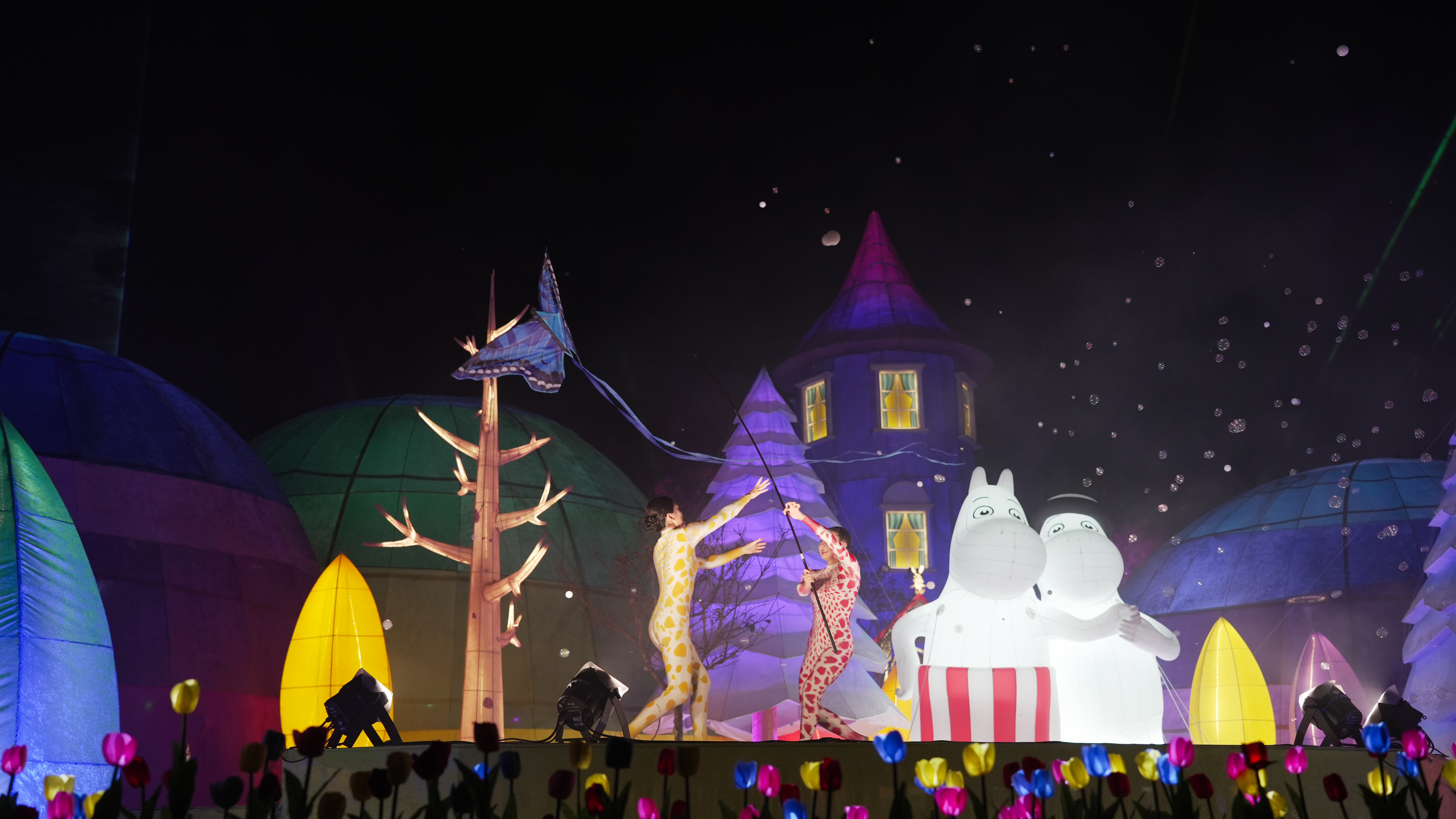 觀旅局長陳美秀表示,今年燈會以「幸福蜜馬 台中MOOMIN ON!」為主題,攜手Rights and Brands Asia(RBA)旗下來自芬蘭、風靡全球80週年的經典IP「姆明一族(The Moomins)」打造全新燈會體驗。主燈區以60公尺寬巨型童話場景呈現「極光下的姆明谷」,融合全台首創機械動態氣偶、360°全景式環境劇場、原創音樂、表演藝術及特效泡泡,打造沉浸式聲光秀。觀眾不只是「看燈」,而是彷彿走進北歐童話世界,成為姆明谷的一份子,在極光般層層鋪展的光影中,感受療癒與溫暖的新春祝福。