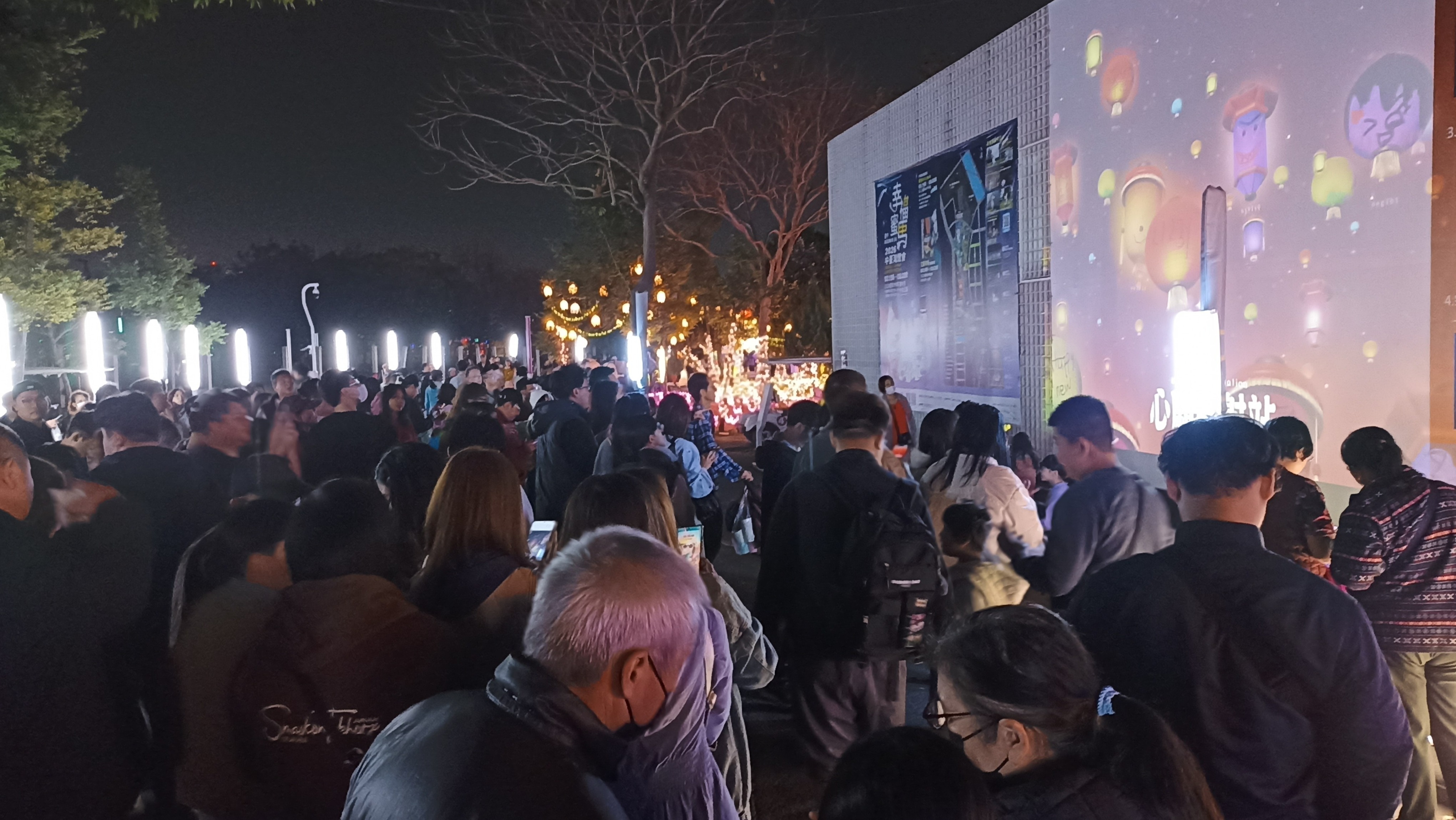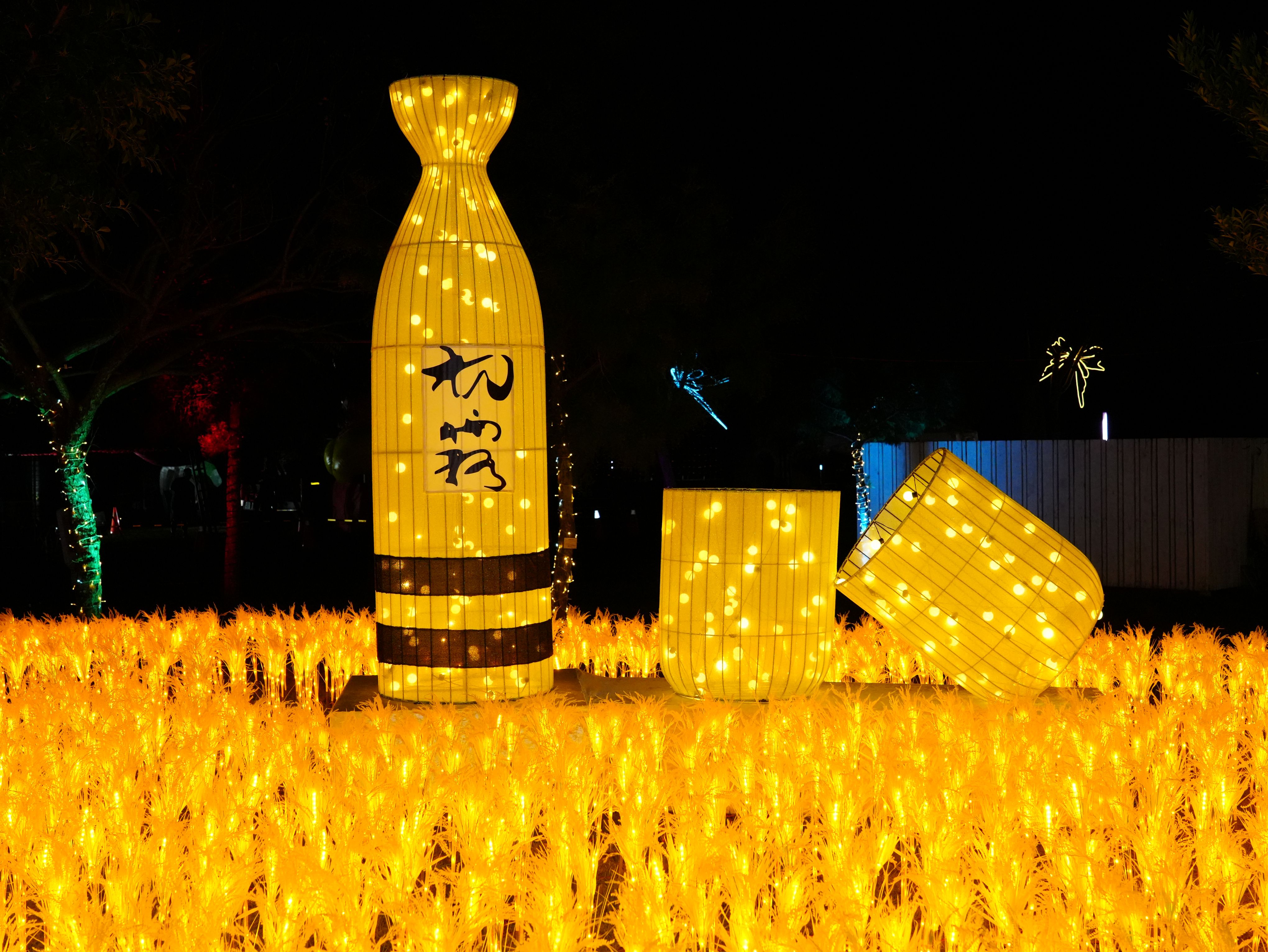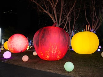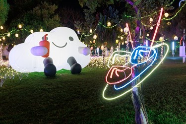 此外,屯區以霧峰益全香米釀造的「初霧‧純米吟釀」清酒燈組結合金黃稻穗,象徵豐收與甘甜生活;城區則以中區中山路舊稱「鈴蘭通」為發想,高掛鈴蘭花燈並融入夜市小吃文化,其中啵啵雲喝珍奶坐在草地上的俏皮造型,更成為遊客必拍的療癒打卡亮點。