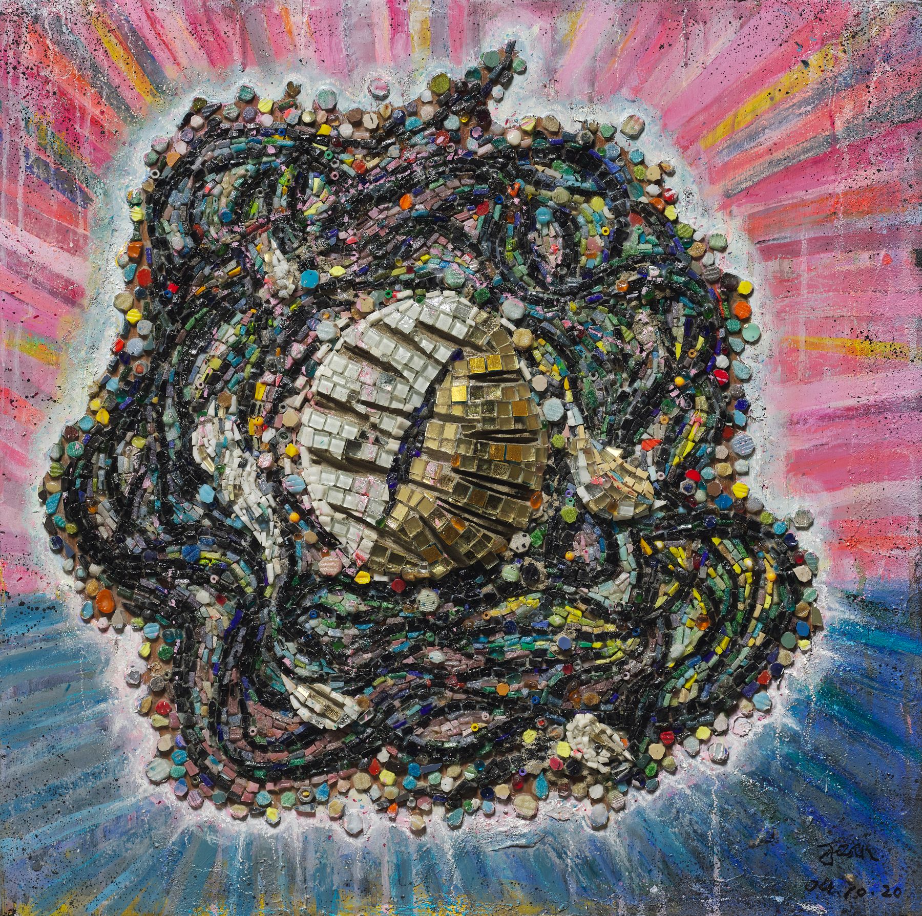 其中「若水」系列的靈感來自2021年台灣面臨「百年大旱」,當時盧秀燕市長向大甲鎮瀾宮媽祖祈求天降甘霖,觸動簡教授以流經台中市的溪流為題,希望藉由馬賽克畫作緩緩鋪展台中土地的故事與時間的流向,讓看似細碎的素材,匯聚成一股靜謐而強大的生命暖流。