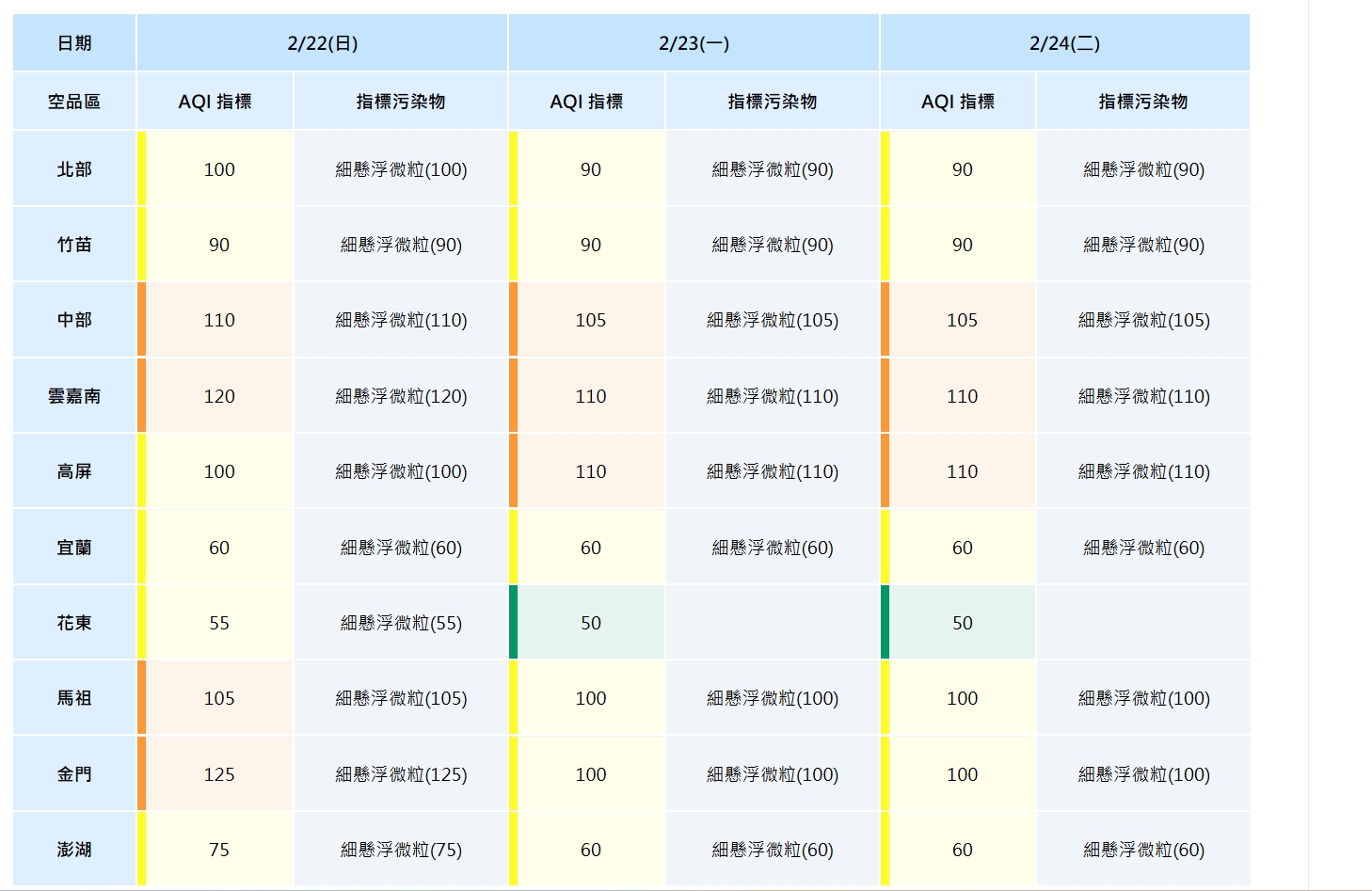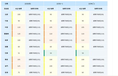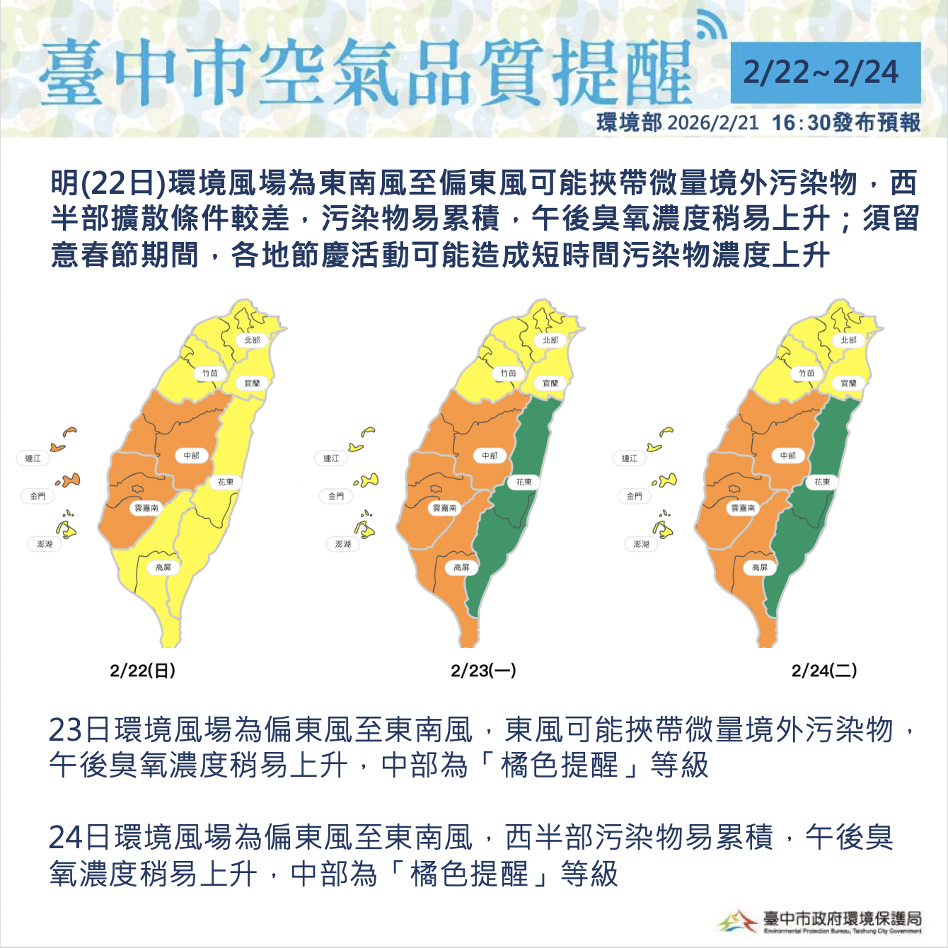 依環境部及中央氣象署預報資料顯示,明(22)日起因環境風場變化及微量境外污染影響,未來三日中部空品皆可能達「橘色提醒」等級,指標污染物為細懸浮微粒,台中市政府已啟動應變措施並持續監控空氣品質狀況,提醒敏感族群留意空品變化,出外做好防護措施。