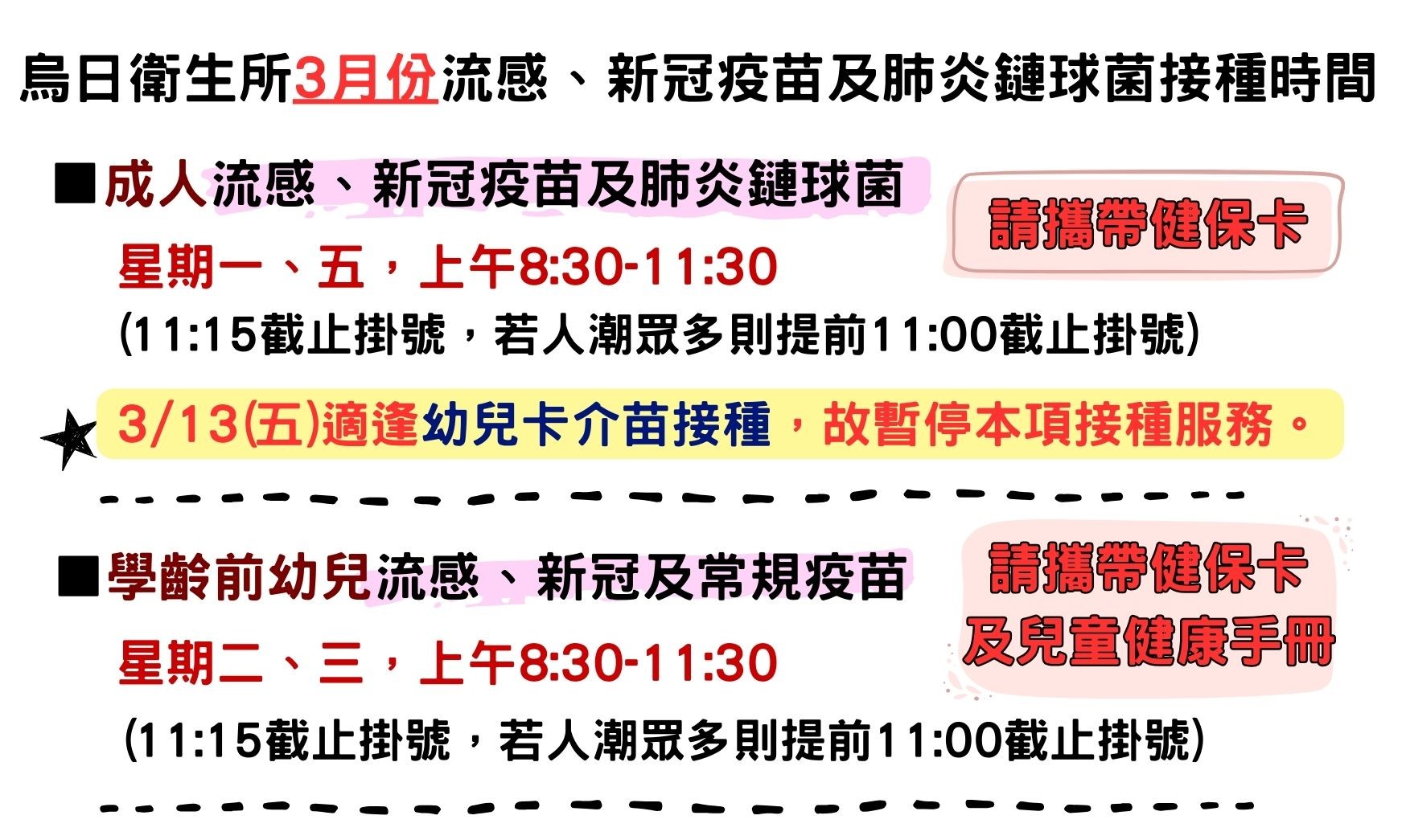 ★3月13日(五)適逢幼兒卡介苗接種,故暫停流感、新冠疫苗及肺炎鏈球菌接種服務。