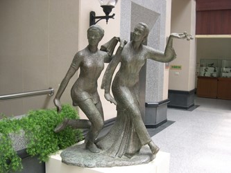 在石色線條的律動中,兩位舞者以優雅的姿態展示著古典的韻味。她們的手臂宛若流動的水,裙裾如同微風拂過的湖面,訴說著千年的故事。這靜止的瞬間,彷彿在無聲中奏響了一曲悠遠的旋律,將觀者引入夢境般的時空交錯。