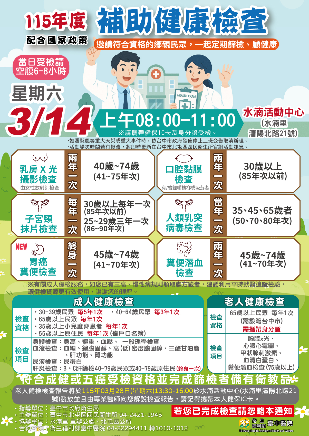 115年3月14日整合性預防保健篩檢活動--水湳里活動中心(臺中市北屯區水湳里瀋陽北路21號)