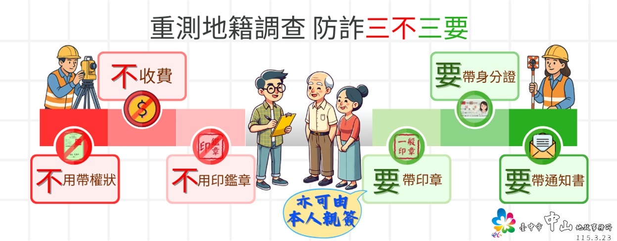 為了避免不肖人士假借地籍圖重測名義詐騙,土地所有權人若收到「地籍圖重測地籍調查通知書」,請大家牢記以下「三不三要」原則: