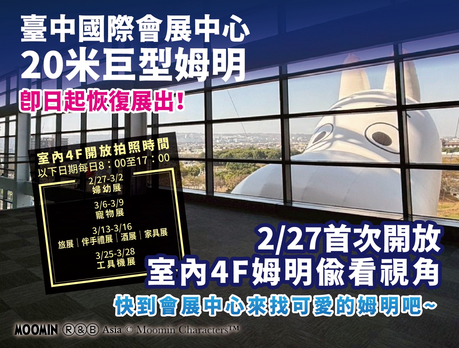 經發局說明,會展中心巨型姆明展期至3月31日止,無論平日或假日皆可前來拍照留念;每日17時至22時亮燈展示,白天、夜晚呈現不同風貌。至於熱門的「4樓室內與姆明合影」點位,須配合會展中心營業時間及各展覽檔期入館。室內開放拍照時段包括:婦幼展2月27日至3月2日、寵物展3月6日至3月9日、旅展/伴手禮展/酒展/家具展3月13日至3月16日,以及工具機展3月25日至3月28日,展覽期間每日上午8時至下午5時開放。相關參觀資訊請以台中國際會展中心官網(ticec.com.tw)「參觀訪客/活動資訊」公告為準,建議事先查詢開放時段,以免錯過最佳合影時機。