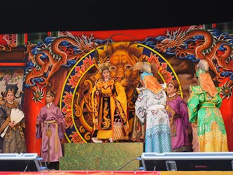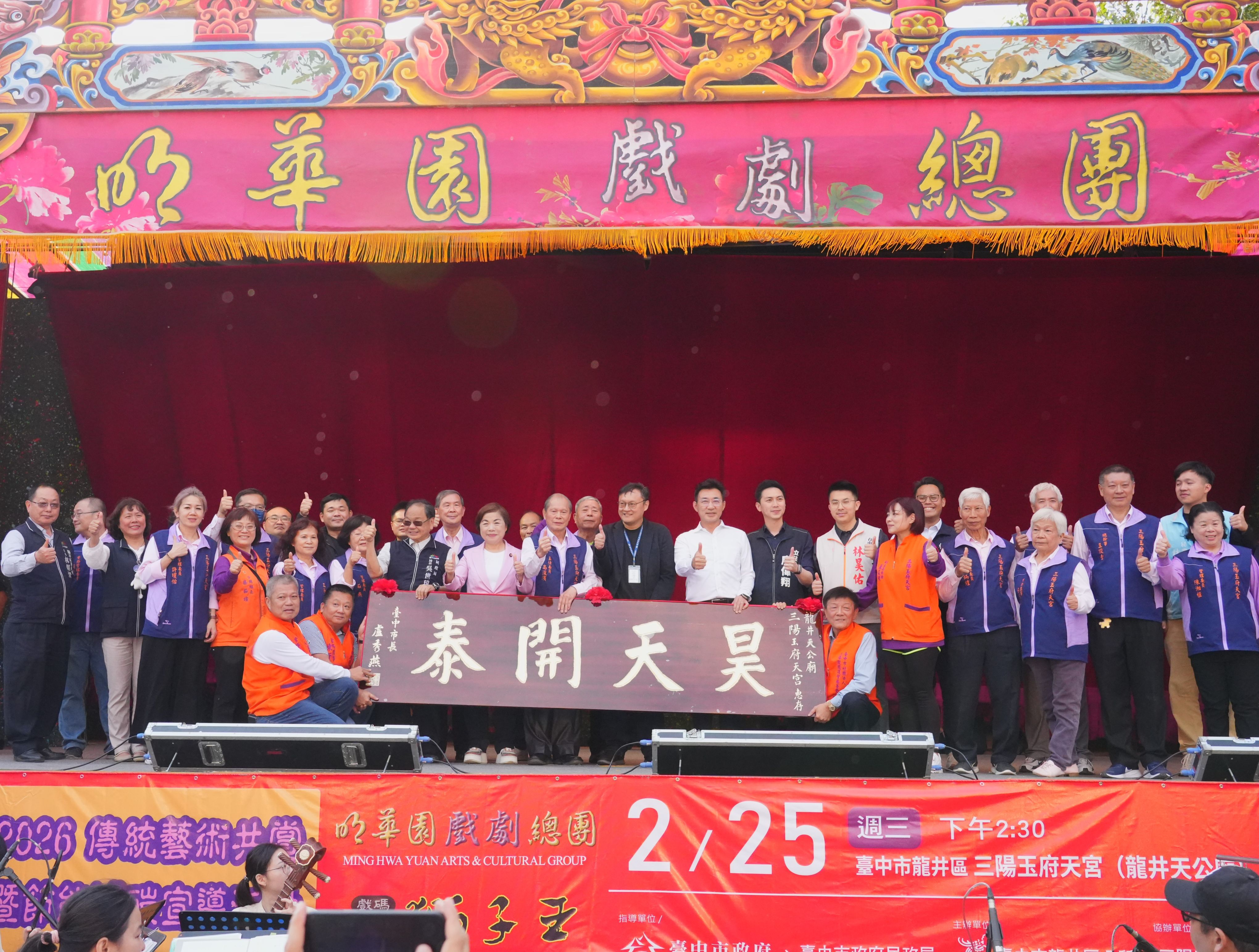 今(25)日是農曆正月初九玉皇大帝聖誕,俗稱「天公生」,台中市龍井區公所盛大邀請「明華園戲劇總團」於龍井三陽玉府天宮(龍井天公廟)帶來經典戲碼《獅子王》,以磅礡舞台魅力展現傳統戲曲的多元風貌與97年深厚傳承實力,為天公生慶典增添藝術亮點。副市長鄭照新代表市長盧秀燕到場,感謝明華園與三陽玉府天宮共同推廣傳統藝術、傳承在地宗教文化,並致贈「昊天開泰」匾額,肯定廟方長年護佑地方、投入公益的卓越貢獻。