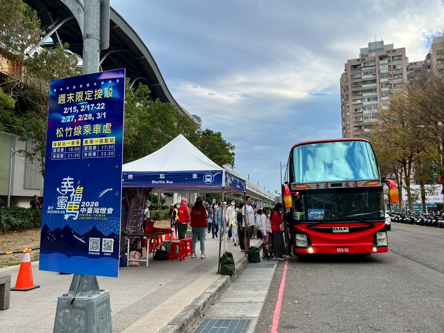 燈會期間,交通局於假日規劃「市府線」與「松竹線」兩條免費接駁路線,並依現場人潮即時調整班次,採「坐滿即發車」方式提升接駁效率。許多搭乘民眾表示候車時間短,並可透過捷運、台鐵及高鐵轉乘順利抵達會場,整體接駁服務便利順暢。