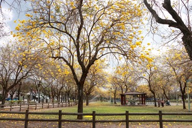 建設局長陳大田表示,今年黃花風鈴木花季預估自3月上旬進入盛開期,最佳觀賞時間約可持續至3月下旬,實際花況仍將視天候狀況略有差異。近期市區多處黃花風鈴木已陸續綻放,金黃色花朵在枝頭燦爛盛開,形成亮麗花景,如北屯區新都生態公園、廍子公園,南屯區豐富公園與環中路四段,以及東區泉源公園、北區台中公園等地,皆是熱門賞花地點,邀請民眾把握花期前往感受滿城花海的春日風情。