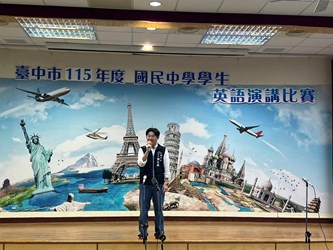 台中市政府教育局今(10)日於市立光復國民中小學舉辦115年度中市國中學生英語演講比賽。此次比賽分為4組進行,由台中市公私立國中各派1名學生代表參賽,共計89位學生同場競技。賽程分上下午場次,透過分組競賽的模式,不僅為學生搭建英語學習成果的舞台,更促成各校師生間的觀摩與深度交流。