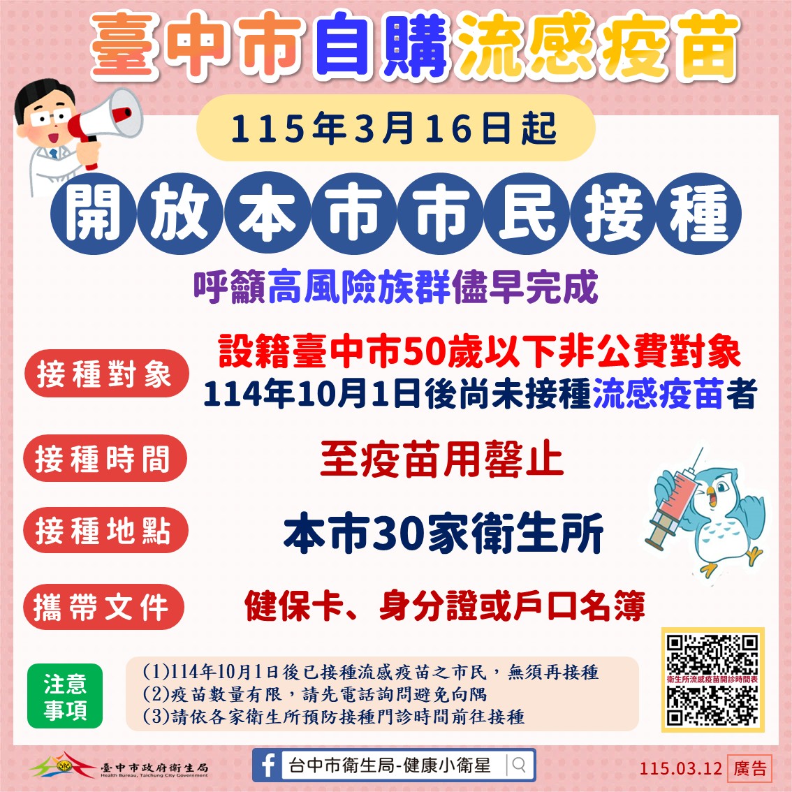 流感疫情仍於社區持續傳播,為提升市民整體防護力,台中市政府自購流感疫苗將自115年3月16日起開放設籍台中市、50歲以下且非公費流感疫苗對象接種。