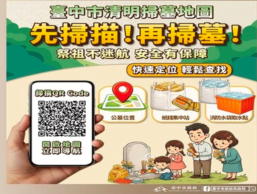 消防局也說,「台中市清明掃墓地圖」已正式上線,民眾可透過「台中通APP」或掃描專屬QR Code,查詢全市公墓位置、紙錢集中處、消防水袋取用點等相關資訊,方便市民事先規劃掃墓行程,歡迎市民多加利用,共同提升掃墓期間安全與便利。