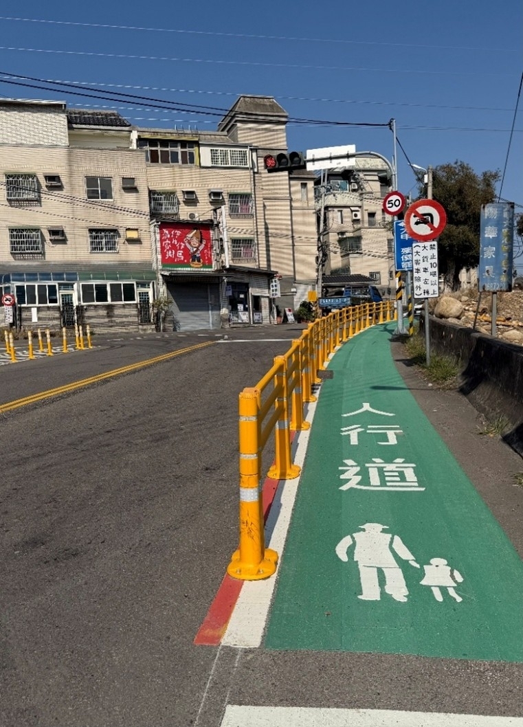 為保障學區步行環境安全,台中市政府交通局積極爭取中央經費補助,並攜手大甲區公所合作推動道路改善工程,運用「車道瘦身」策略,於開元路完成標線型人行道劃設,克服人行道不足的困難,有效改善人車爭道。交通局長葉昭甫表示,標線型人行道與實體人行道具相同效力,明確區隔人車通行空間,守護學生及在地居民步行權益。