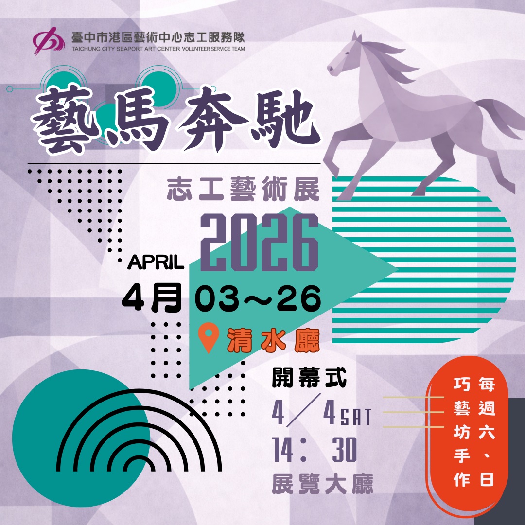 港區藝術中心志工隊將於2026年4月3日至4月26日於清水廳舉辦《藝馬奔馳・志工藝術展》,並於4月4日(五)下午14時30分舉行開幕式。誠摯邀請各界蒞臨,共同欣賞志工夥伴們精彩豐富的創作成果。
