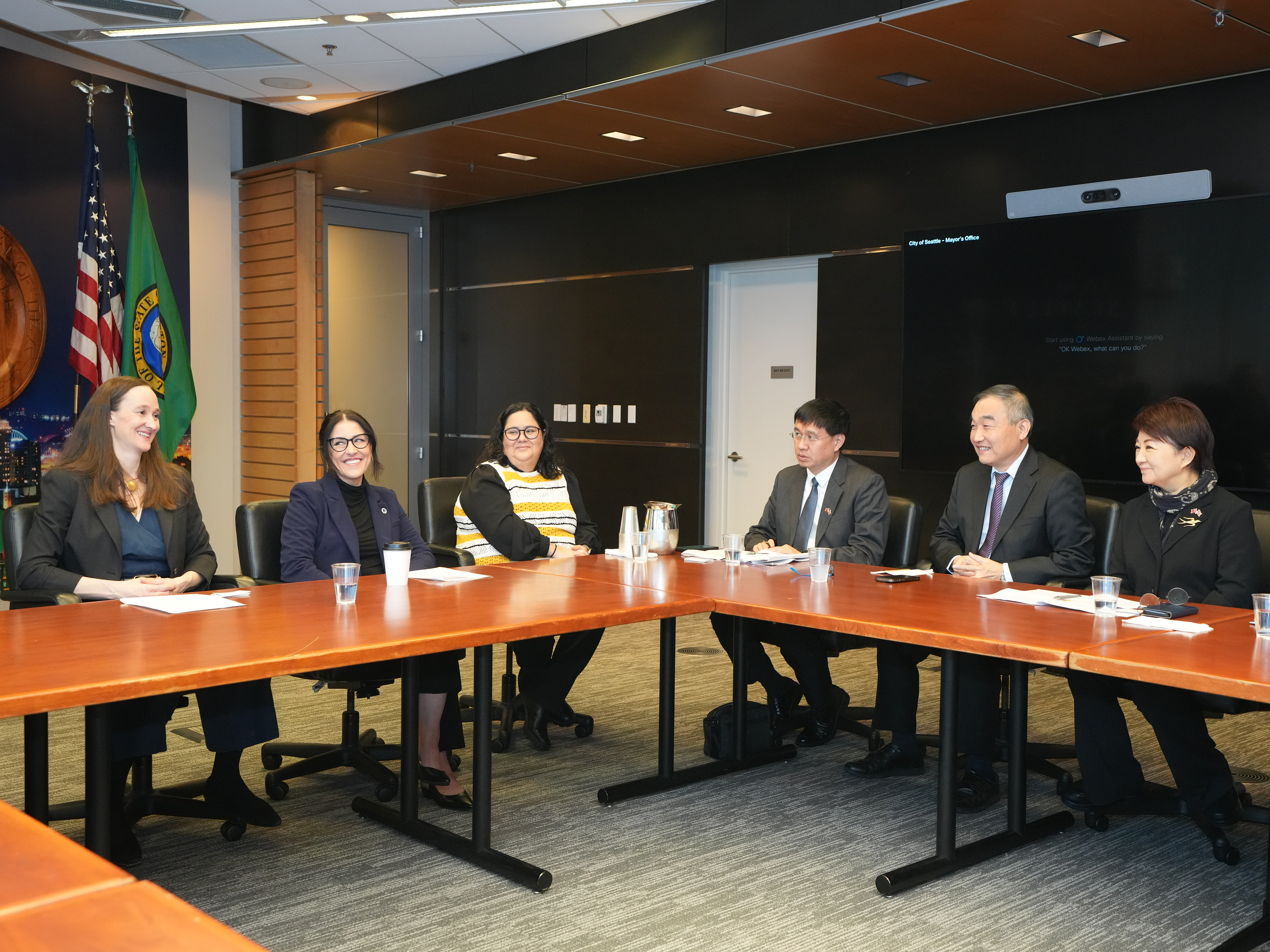 盧市長訪美11天跨越美國5州、9行政區,最後一天行程依舊滿檔,在搭乘深夜班機返國前,把握時間進行城市外交。美西時間19日一早先拜會今年1月剛上任的西雅圖市長凱蒂·威爾遜(Katherine Barrett Wilson)。兩位女性首長一見如故,針對各大城市共同面臨的「居住正義」與「大眾運輸」等核心市政議題展開交流。