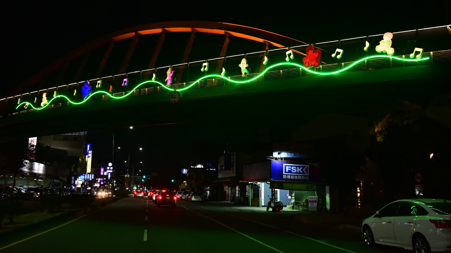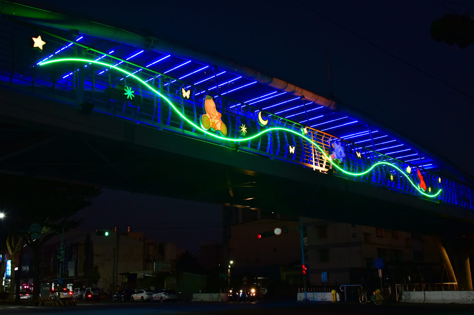 市府表示,透過線性光帶、造型燈箱與意象圖案的結合,橋梁與空橋在夜間形成具有辨識度的光環境景觀,騎士穿越節點時可感受到流動的光影氛圍,打造具有記憶點的騎乘體驗,未來將持續優化自行車騎乘環境與景觀節點,打造兼具安全、休閒與觀光特色的自行車路網,讓民眾在自行車道享受健康、友善且富有城市魅力的騎乘體驗。(3/25*10)*觀光旅遊局