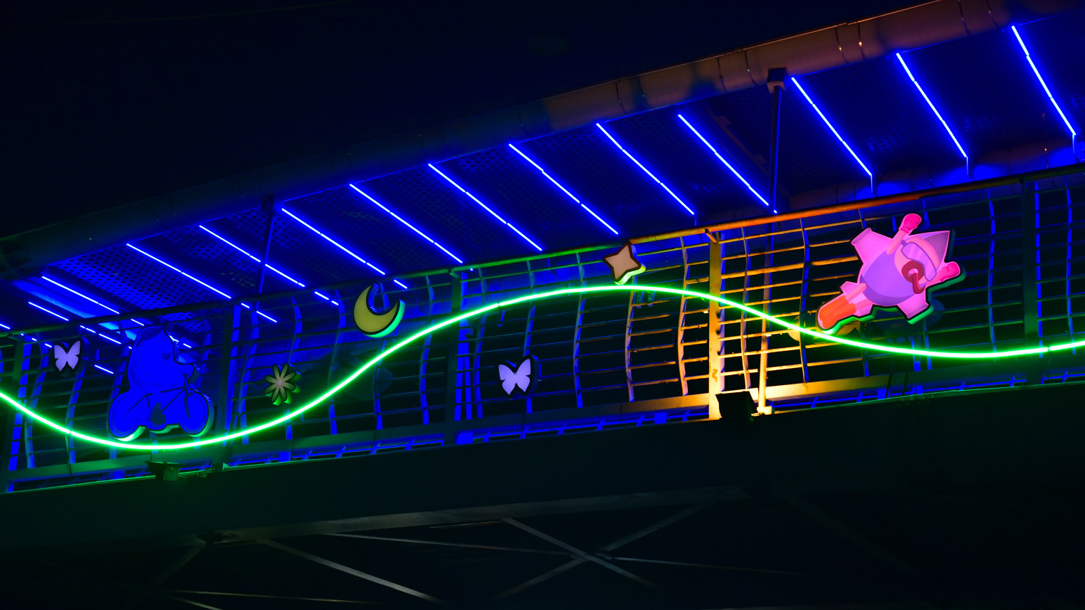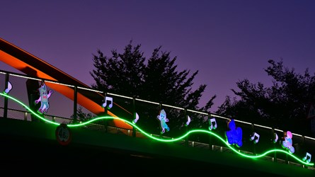 此外,燈箱設計融入富有活力的圖像元素,包括自行車、律動音符與舞動身影等圖案,象徵騎乘節奏與休閒活力。夜幕降臨時,燈光與圖像交織出動感的光影氛圍,彷彿在綠園道上演一場輕快的光影節奏,讓騎士在前行之間感受活力與趣味。
