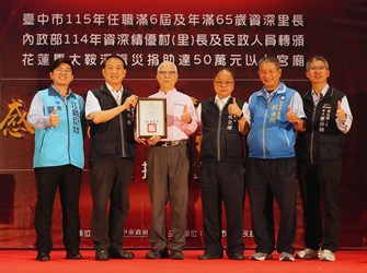 除向基層致敬,民政局也特別感謝7間宮廟於去年花蓮馬太鞍溪堰塞湖溢流災害發生後,主動捐贈50萬元以上善款,協助提升救災量能,其中南屯萬和宮及清水紫雲巖各捐贈200萬元;西屯惠來里福德祠及北區重生堂各捐贈60萬元;南區醒修宮、豐原慈濟宮及北區寶覺寺各捐贈50萬元。民政局指出,宗教團體在災害發生時主動伸出援手,展現回饋社會的正向力量,不僅為災區注入溫暖,也成為政府推動救災工作的有力後盾。