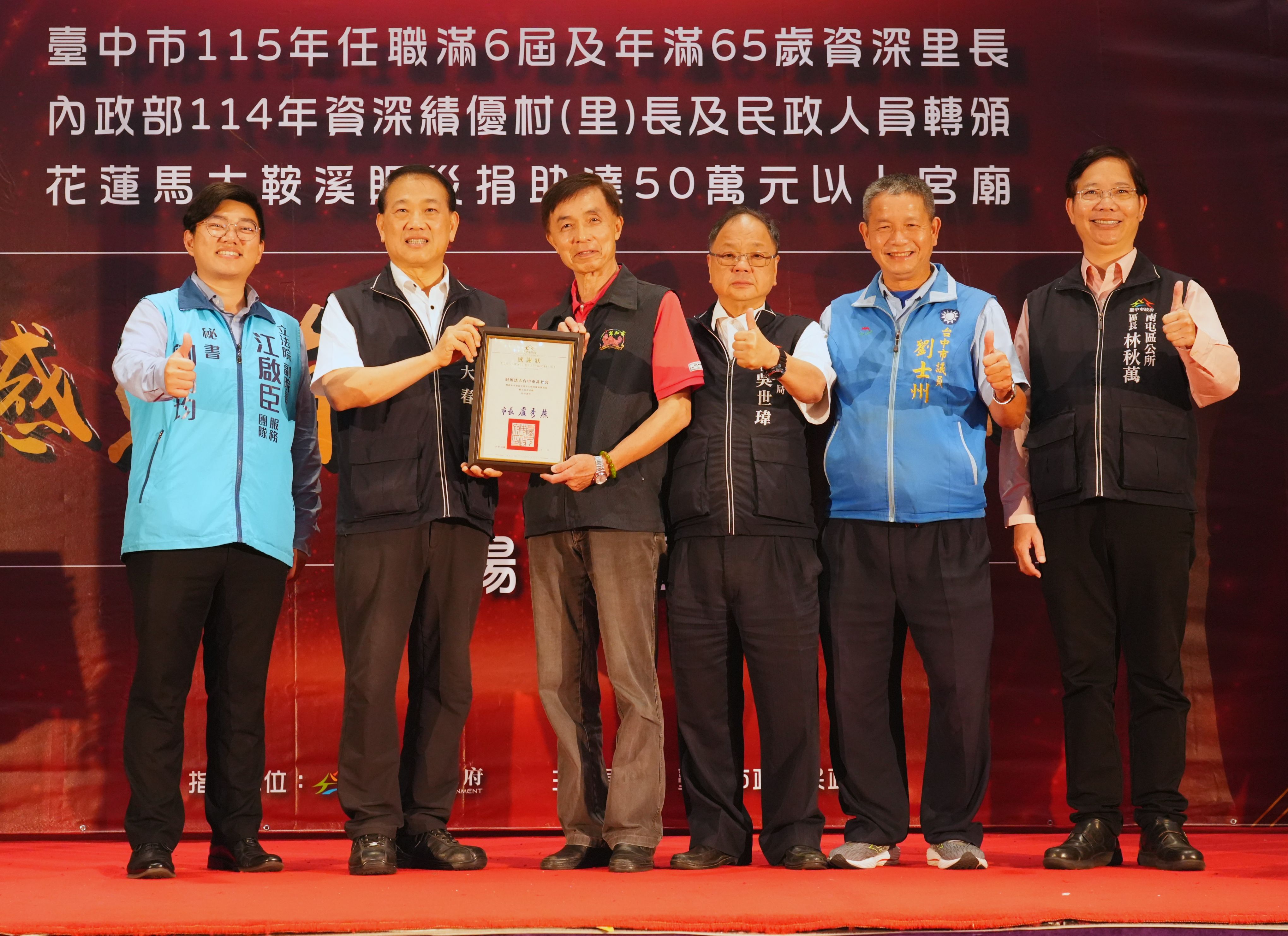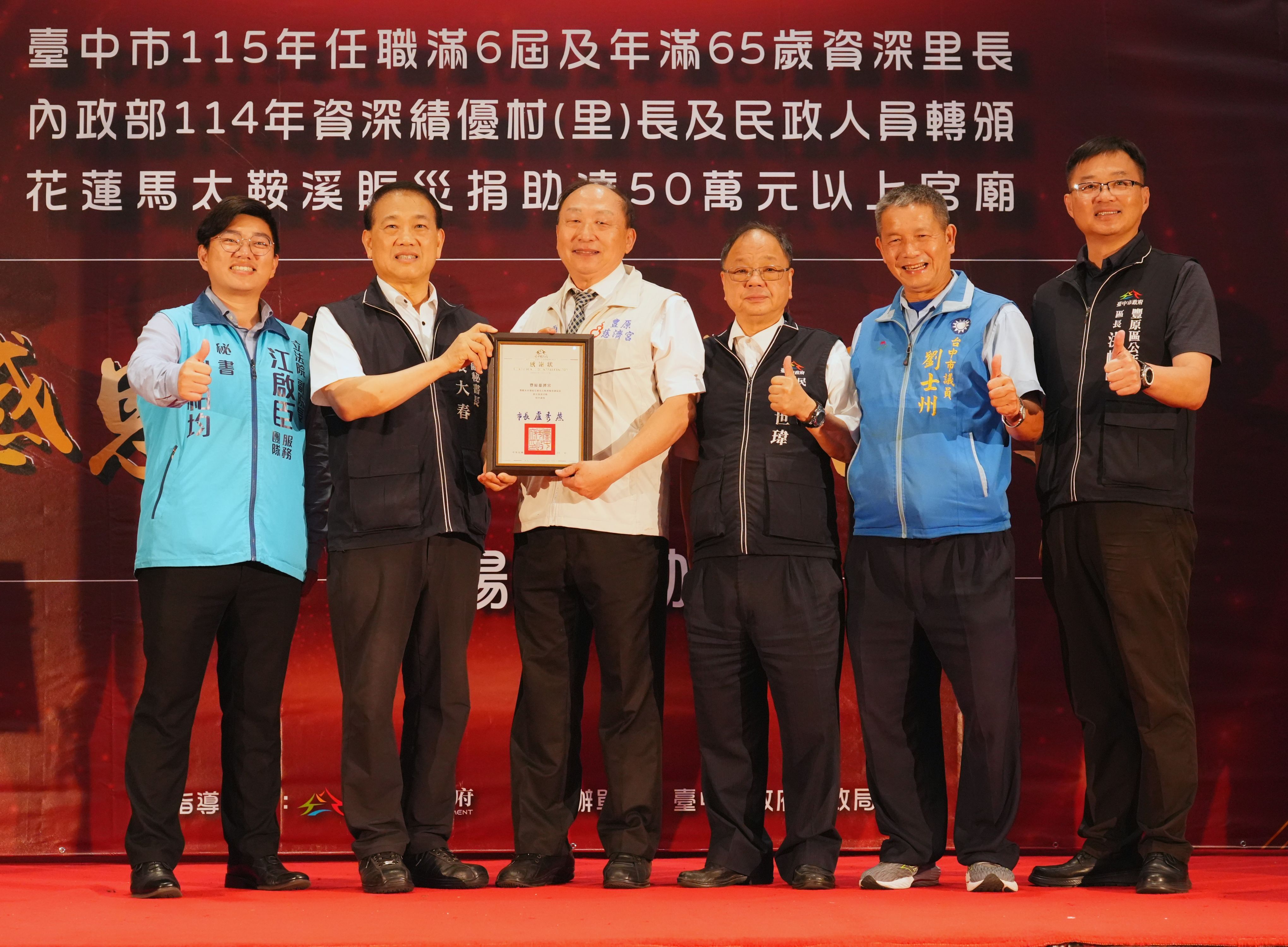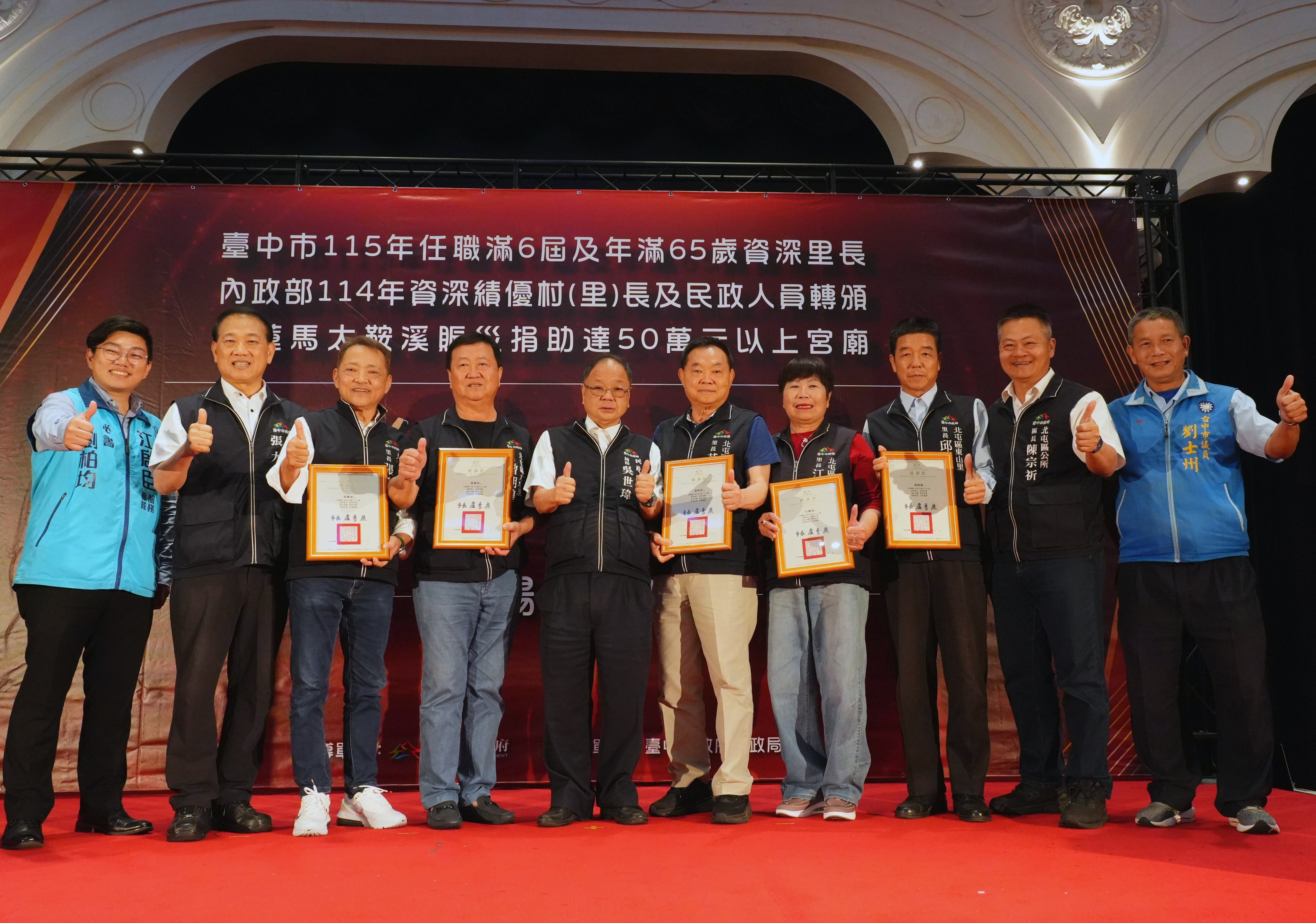 為感謝基層人員長年付出及宗教團體熱心公益,台中市政府民政局昨(25)日晚間舉辦「感恩有您,榮耀同行」表揚活動,表彰全市48位任職滿6屆且年滿65歲的資深里長,以及捐助花蓮馬太鞍溪賑災善款逾50萬元的7間宮廟代表,並轉頒內政部114年資深績優村(里)長及民政人員獎項。副秘書長張大春代表市長盧秀燕出席,肯定基層深耕地方、協助市政推動,也感謝宗教團體以實際行動回饋社會,傳遞溫暖善意。