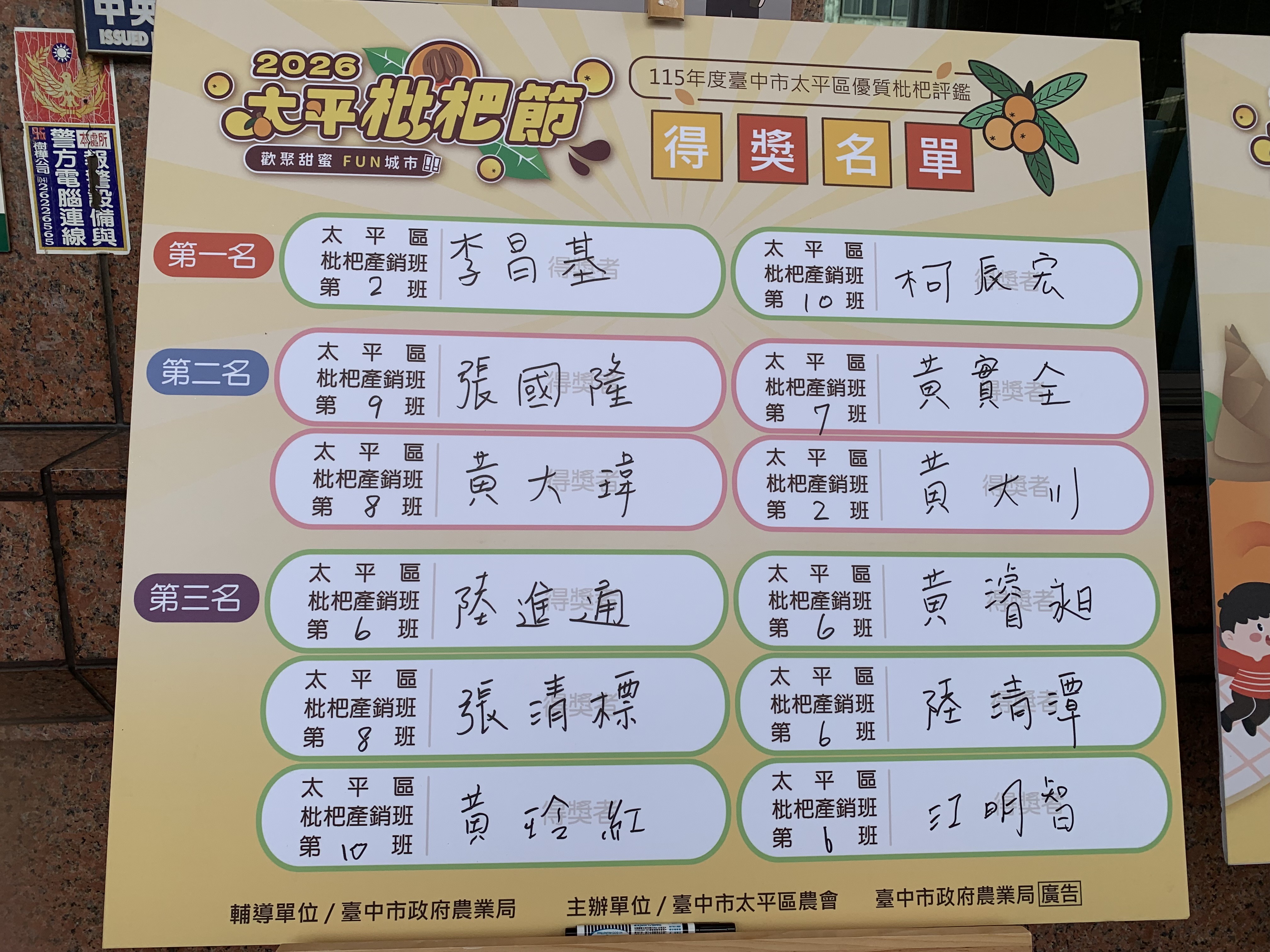 台中市優質枇杷再傳佳績!台中市政府農業局輔導太平區農會於昨(26)日舉辦「115年度台中市太平區優質枇杷評鑑活動」,透過專業評比選出年度優質果品,此次共有50組農友參賽,最終由李昌基及柯辰宏脫穎而出,榮獲「枇杷王」,展現台中枇杷高品質與農友精湛栽培技術。