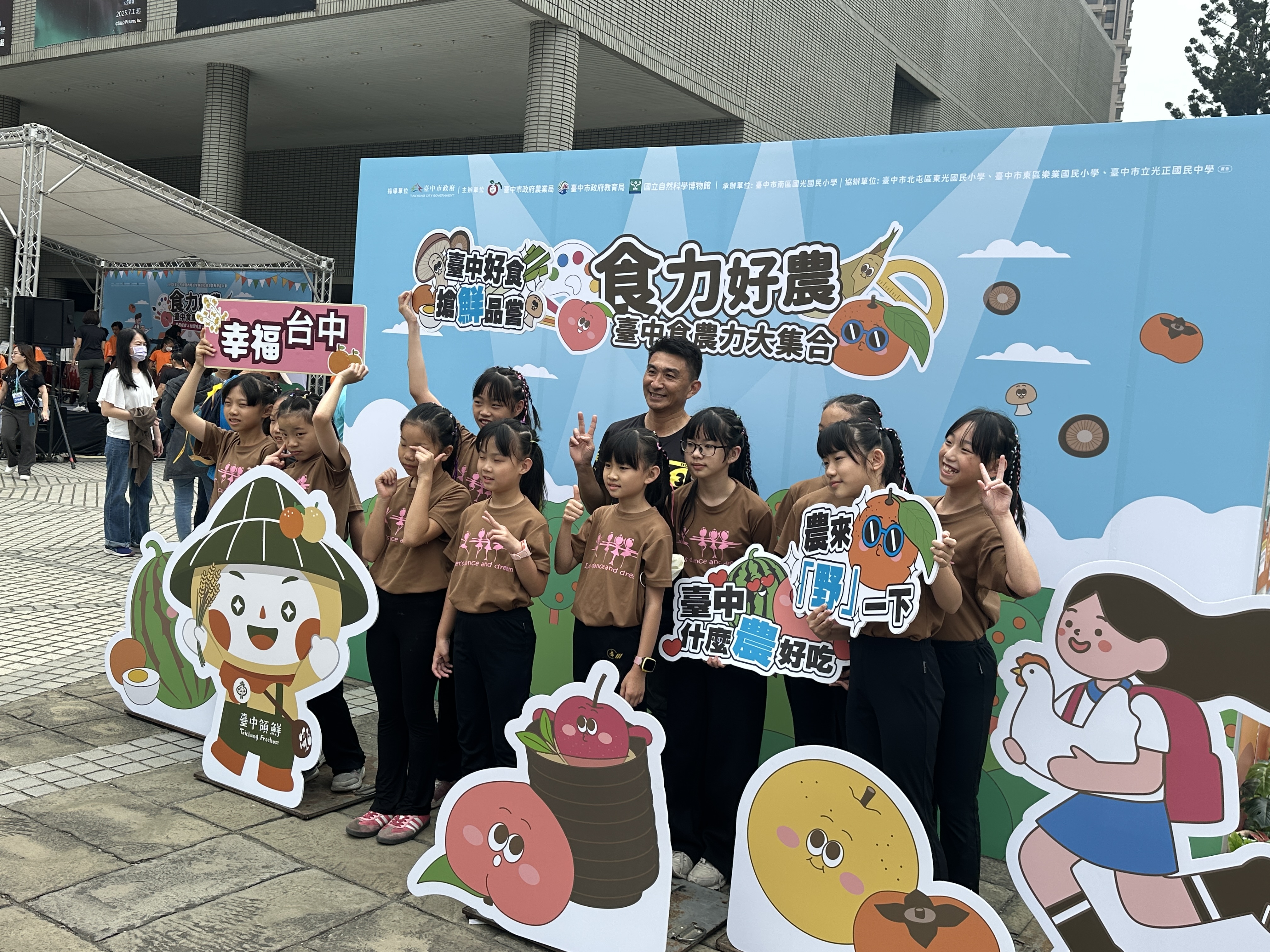 農業局說明,活動現場設置「豐農好食力」成果展示區,透過圖文呈現中市推動食農教育及農產行銷的具體成果,並搭配闖關學習活動,引導民眾在互動過程中認識農業知識與飲食文化。舞台活動則安排食農知識賓果遊戲及故事分享,並由台中領鮮吉祥物「小鮮」與國光國小舞蹈社帶來精彩演出,現場氣氛熱絡。